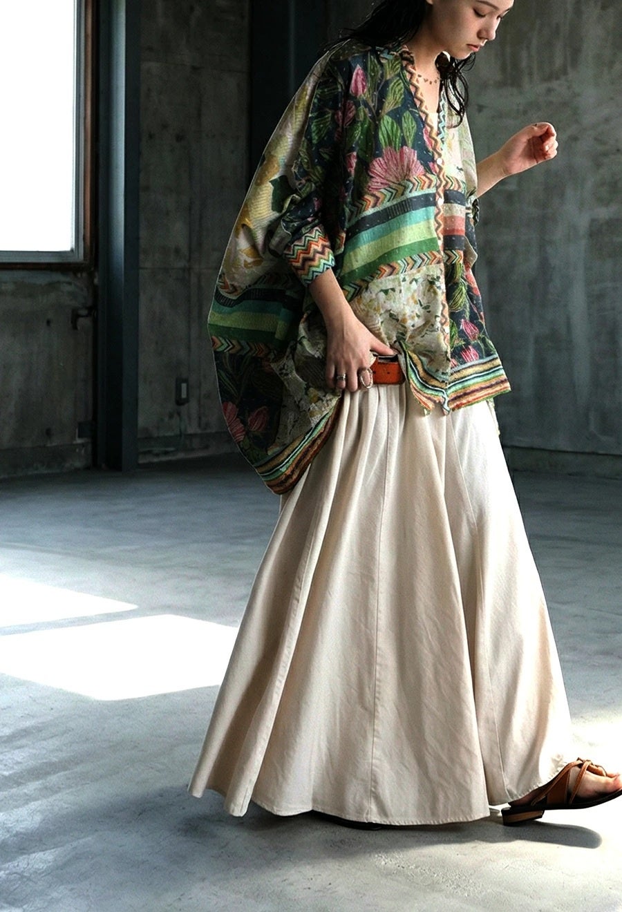 足首まで届く丈感で体型カバーも叶え、前開き仕様で羽織りとしても活躍。