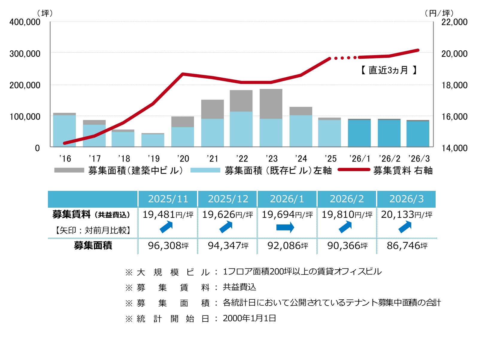 募集賃料は前月比プラス323円/坪の20,133円/坪と、6ヵ月連続で上昇した。緩やかな上昇傾向が継続し、2000年以降で初めて20,000円/坪を上回っている。