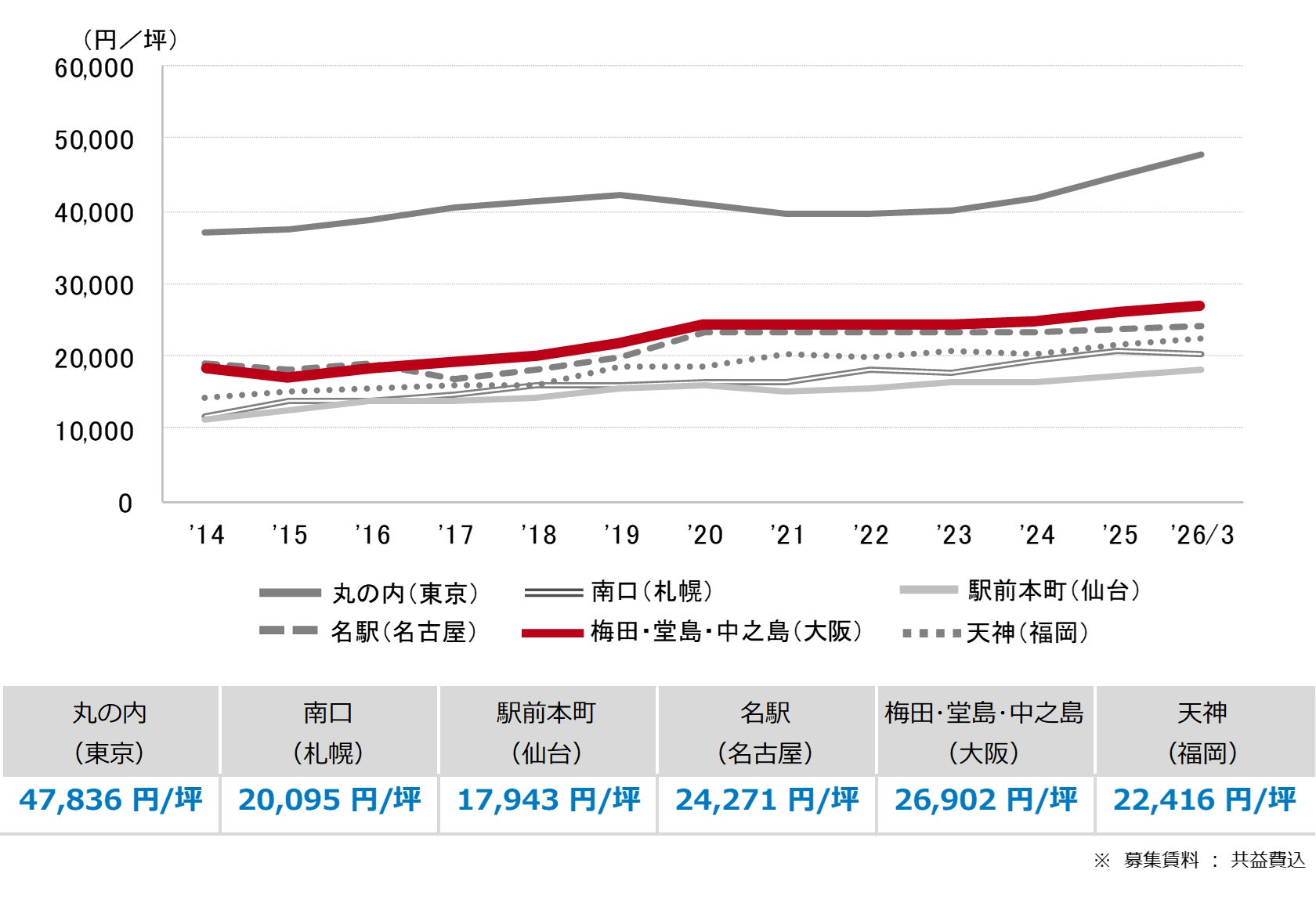 <募集賃料の推移(6大都市 大規模ビル・主要駅前地区)>