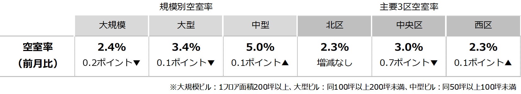 空室率は前月比マイナス0.26ポイントの2.38%となり、3ヵ月連続で低下した。新築ビルでまとまった面積の空室が消化され、主な低下要因となっている。エリア別では「中央区」が前月比マイナス0.7ポイントの大幅な低下となった。潜在空室率は前月比マイナス0.22ポイントの4.09%となった。