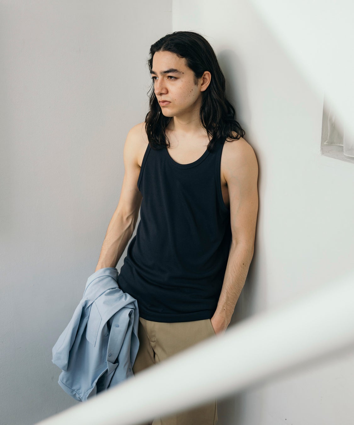 程よいテンションがあり、まるでコットンのような柔らかかつドライ感あるリブ編み素材を使用。シャツなどのインナー使いとして最適です。