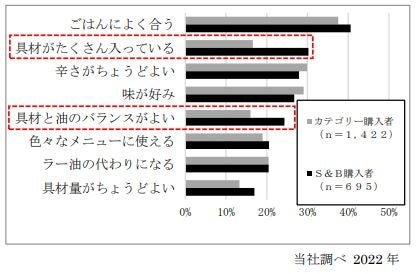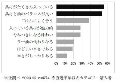 お客様が「おかずラー油」に期待する「具材感」や「具と油のバランス」といった点において、当社のおかずラー油は評価をいただいており、明確な強みがあるといえます。