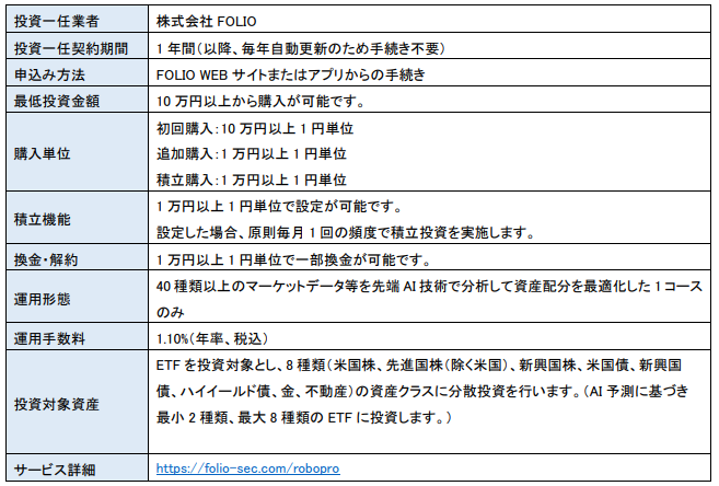 SBI証券とFOLIOは、多様な投資一任サービスの提供を可能にするシステムプラットフォーム「4RAP」の特性を活かし、第1弾商品としてFOLIO が培ってきたAI 運用ノウハウを活用した『AI×投資一任(ラップ)』という新しいジャンルの投資一任サービス「SBIラップ」を提供しています。今後も、「顧客中心主義」のもと、顧客の長期投資に資する第2弾、第3弾となる投資一任サービスを提供すべく、独自の運用ノウハウを有する運用会社との共同開発を進めています。