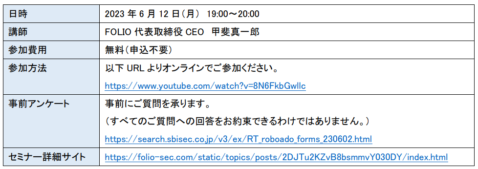 これを記念して、SBI証券およびFOLIOは、お客さまにFOLIOがご提供する「AI投資」の競争力についてよりご理解を深めていただくためのセミナーを、2023年6月12日(月)19時より開催します。