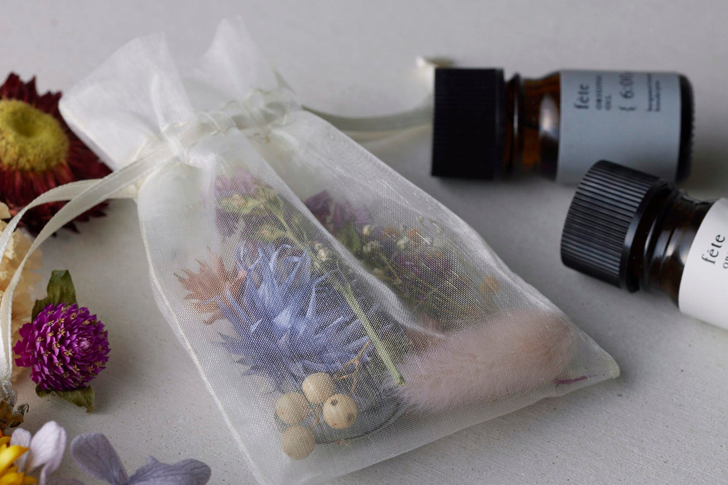 まずは10種類以上のドライフラワーから、お好きなものを選んでオーガンジーの袋に詰めていただきます。さらに下着の製造過程で発生してしまう残材料のアップリケを一緒に詰めて飾り付けし、仕上げにアロマオイルを垂らして完成です。