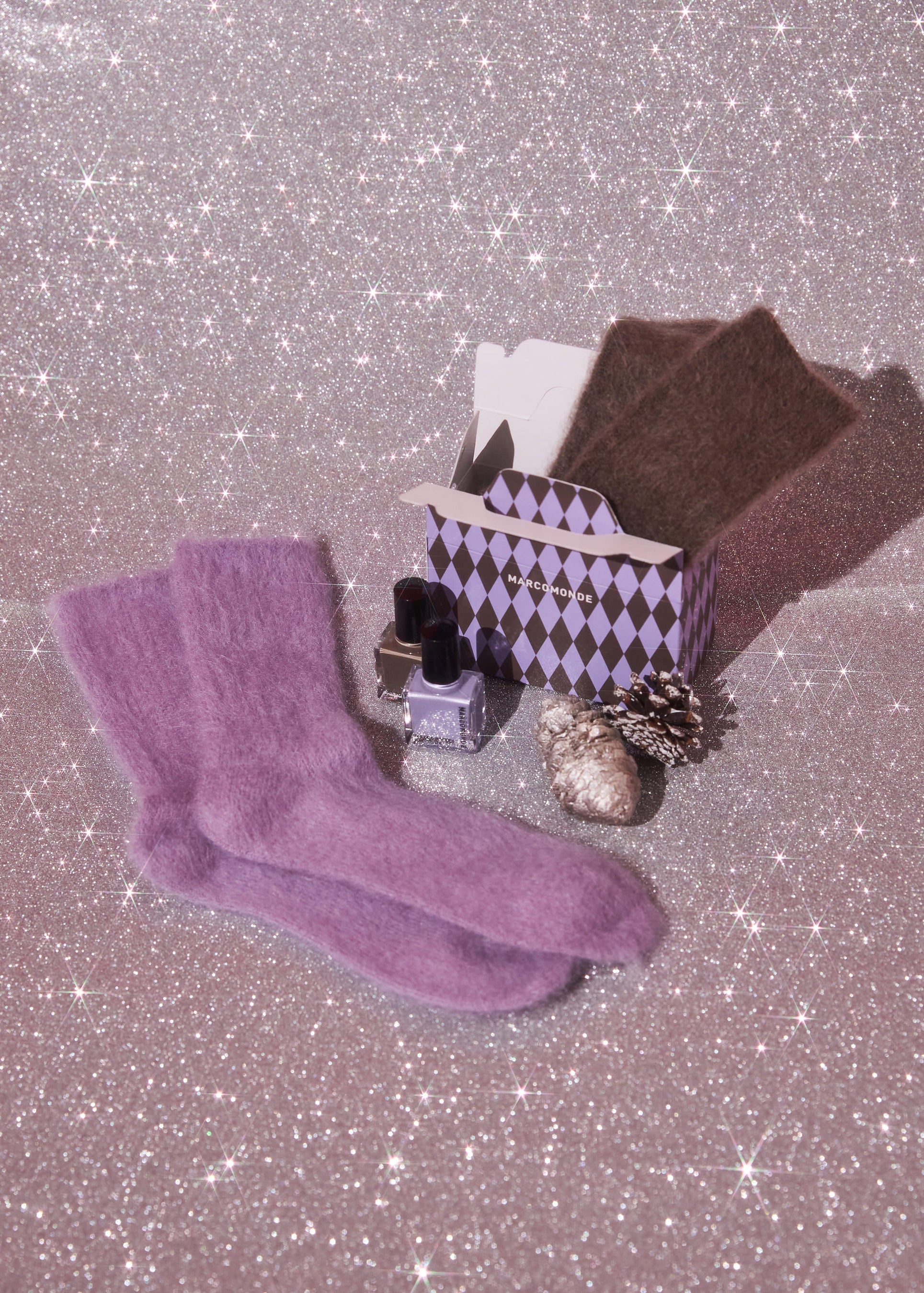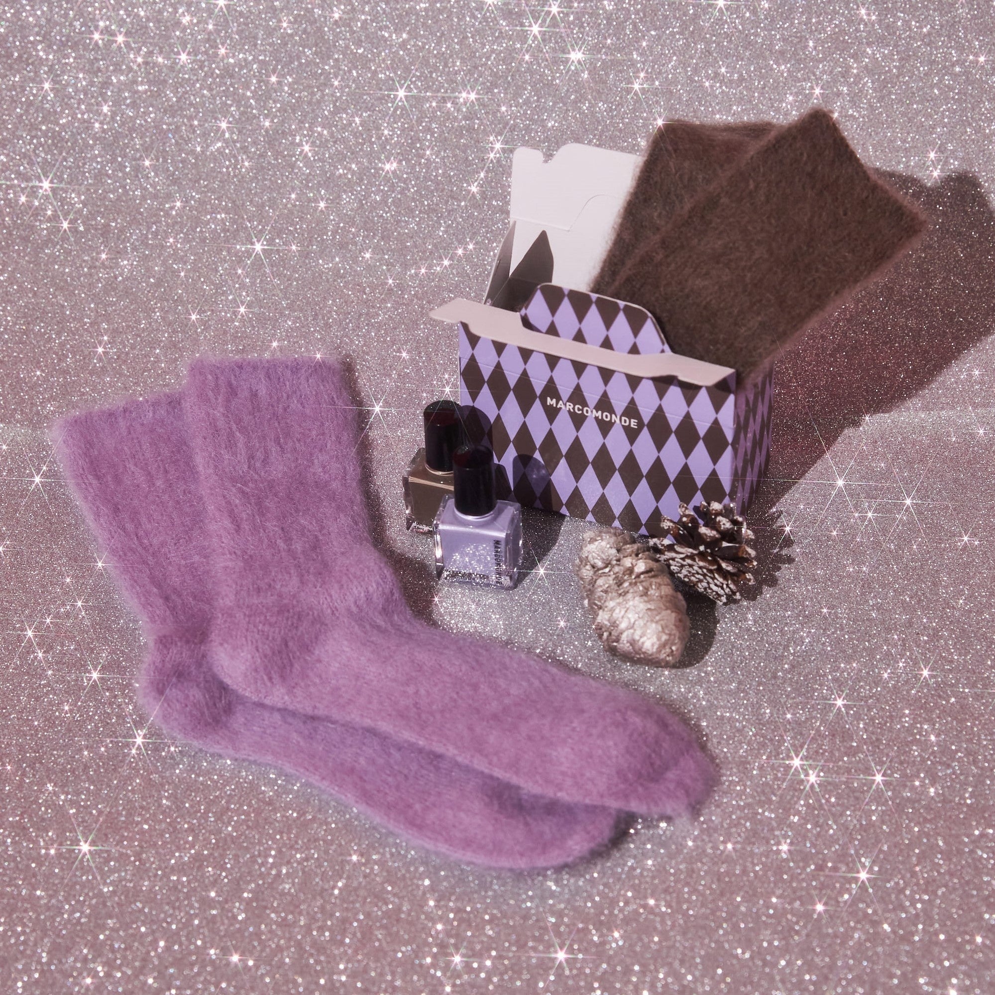 ホリデーシーズンにぴったりのモヘヤのソックスとネイルポリッシュをワントーンで揃えた2点セット。ギフトボックス付きで、プレゼントにピッタリのアイテム。
