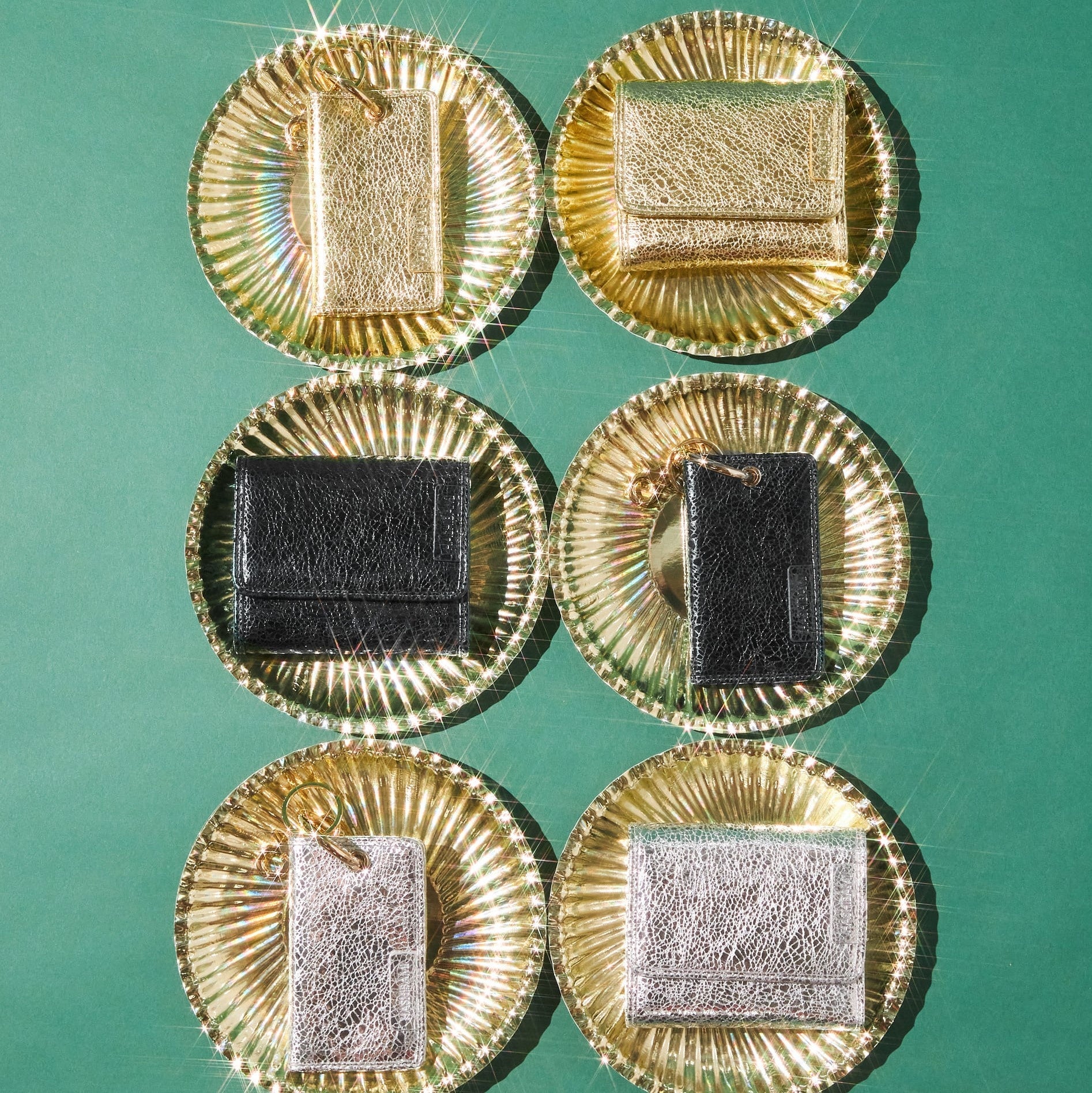 きらきらとしたメタリックなウォレットとキーケース。シワ加工のクラッシュ感が大人な雰囲気で、コンパクトなサイズ感で持ち運びもしやすく、女子の心を満たしてくれるデザイン。