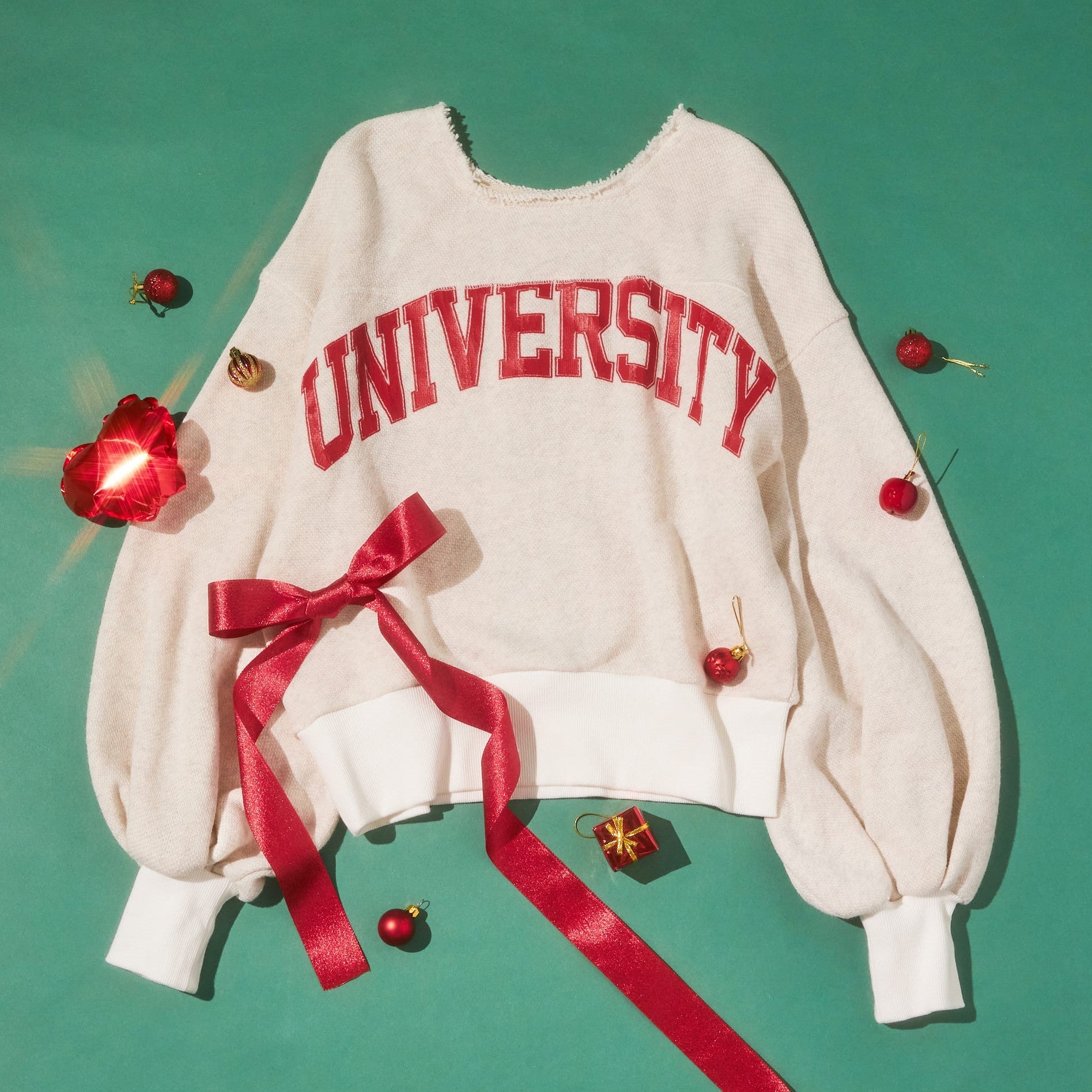 前後2WAY仕様の定番ロゴスウェットは、どちらをフロントにしても着用できる前後2WAY仕様。オートミールとブルーの2色展開で、ホリデームードを高めてくれるカラーリング。