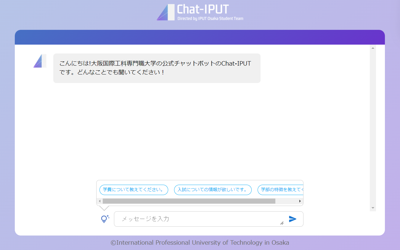 学生有志のプロジェクトチームが、生成AIを活用したオリジナルのチャットボット【Chat-IPUT】を開発。本学のキャンパスライフがリアルにわかる自動応答プログラムです。オープンキャンパス当日は学生たちが、開発秘話から使い方までプレゼンを行います。また、学生と交流しながらチャットボットが体験できるコーナーもあります!