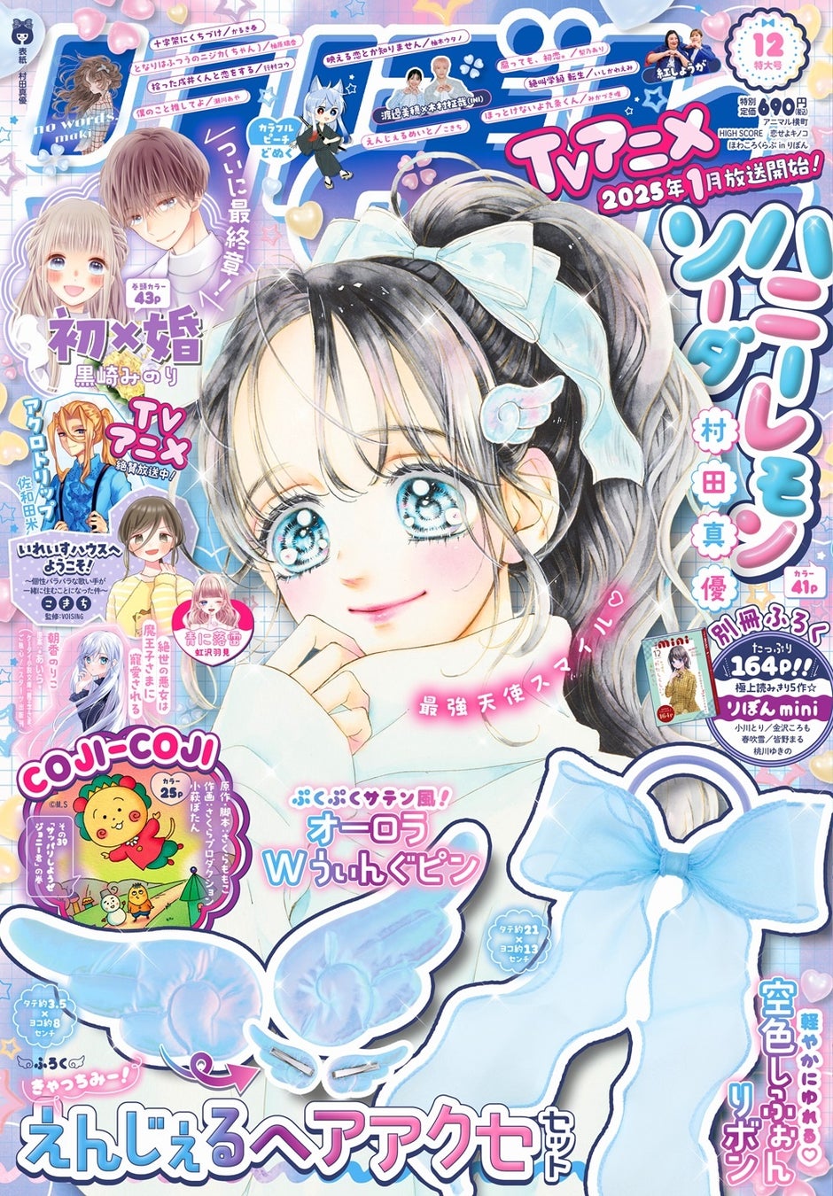 2025年に創刊70周年を迎える「りぼん」は、創刊以来、王道の少女まんがに加え、読者である少女たちのトレンドや興味関心をいち早くキャッチした特集やふろくを届け続けています。2025年1月よりフジテレビ「+Ultra」ほかにてアニメ放送が決定している『ハニーレモンソーダ』(村田真優・著)や、本号より最終章に突入するコミックス累計発行部数260万部超えの『初×婚』(黒崎みのり・著)を筆頭とする人気連載に加え、企画やふろくも盛り沢山の12月特大号にぜひご注目ください。