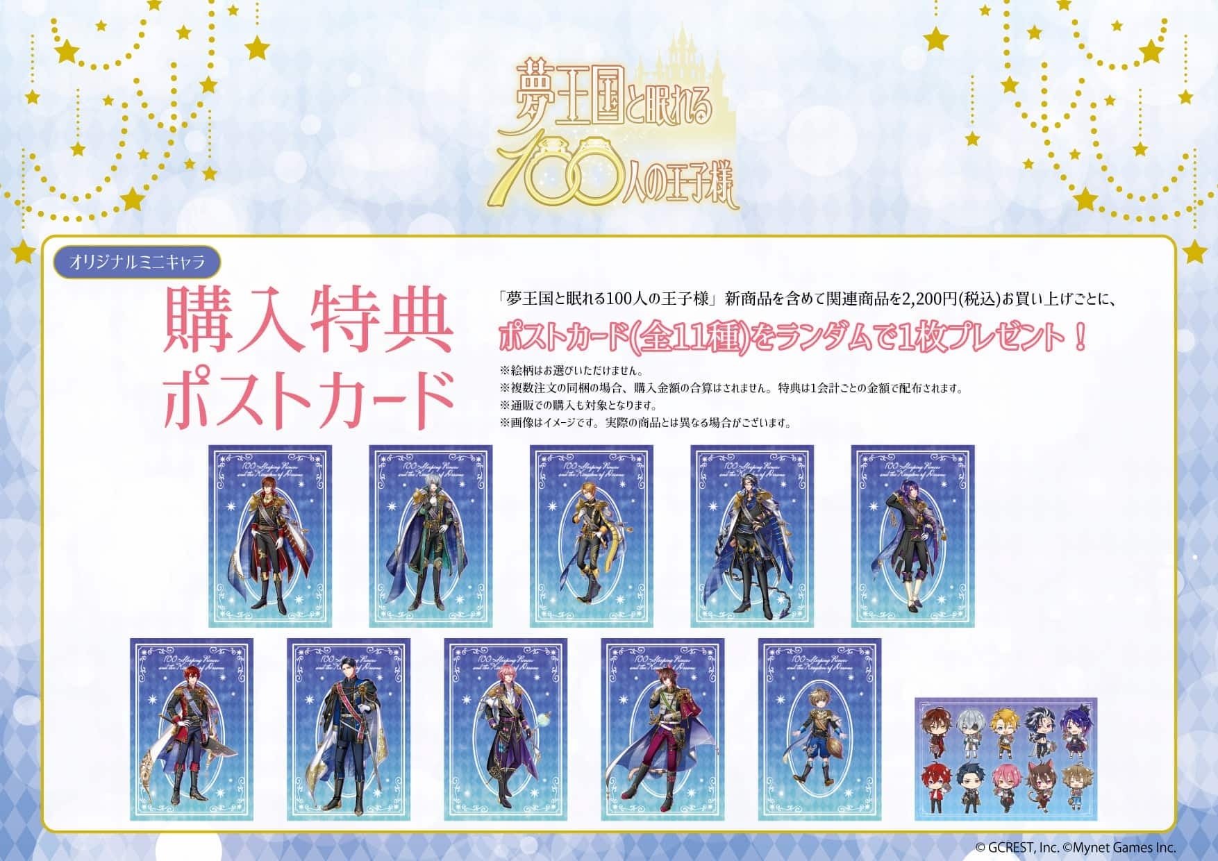 『夢王国と眠れる100人の王子様』新商品を含めて関連商品を1会計2,200円(税込)お買い上げごとに、購入特典としてポストカード(全11種)をランダムで1枚プレゼント。