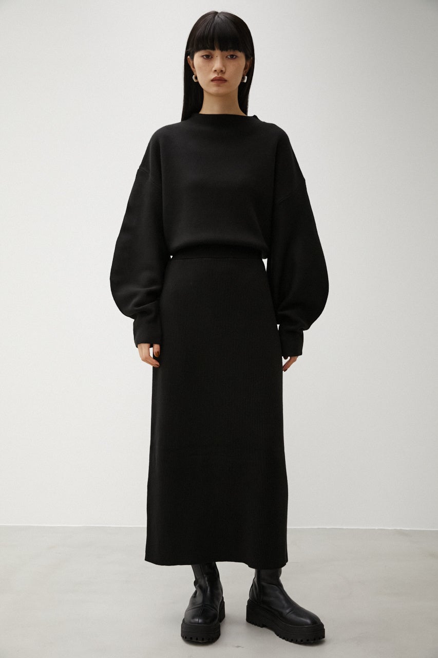 トップスはドロップショルダーでゆったり、スカートはタイトシルエットでメリハリのあるスタイルに仕上がるワンピースです。上半身はしっかりとしたフォルムに、スカート部分は編目を詰めて安心感のある厚みが出せるようにしています。