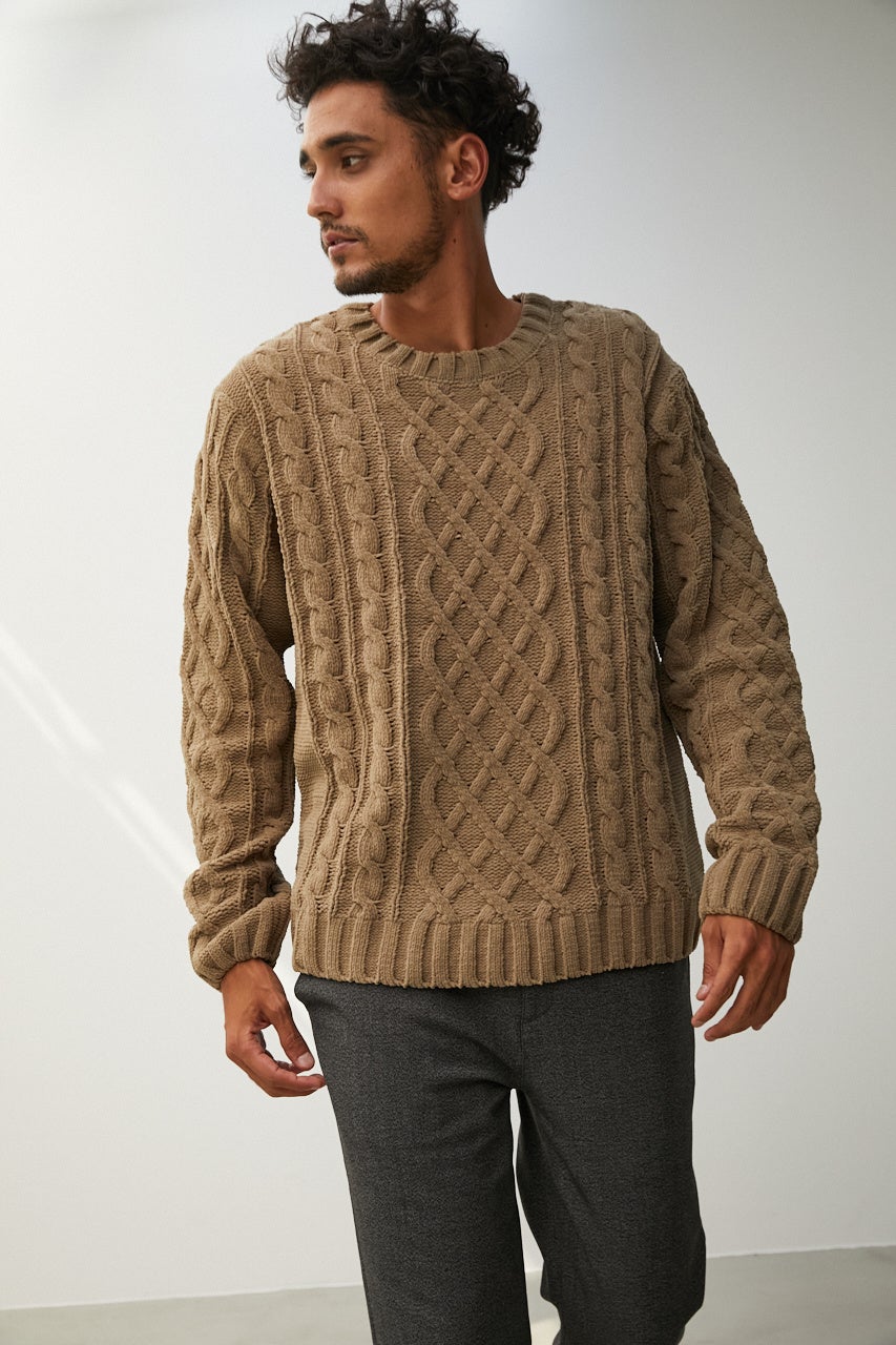 光沢が少なく編み柄の立ちやすいモールヤーンを使用し、アラン柄に編み立てています。テンションのある糸を使用しているため、伸縮性ともっちり感がUPしました。首元、袖口、裾口にはストレッチの糸を編み込み、伸びにくい仕様にしています。