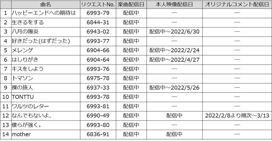 通信カラオケDAMでは『ハッピーエンドへの期待は』収録の全14曲が歌えるほか、本人映像やメンバーのオリジナルコメントを配信します。併せて、直筆サイングッズなどが当たる歌唱キャンペーンも実施中です。
