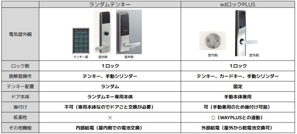 そこで今回、拡大する集合賃貸住宅ドアの需要に応えるべく、新築用アパートドア「リジェーロα」とリフォーム用アパートドア「リシェントアパートドア」において、電気錠『edロックPLUS』を追加し、2024年11月1日より全国で発売します。また、「リジェーロα」で従来設定のあった「ランダムテンキー」は終息となります。