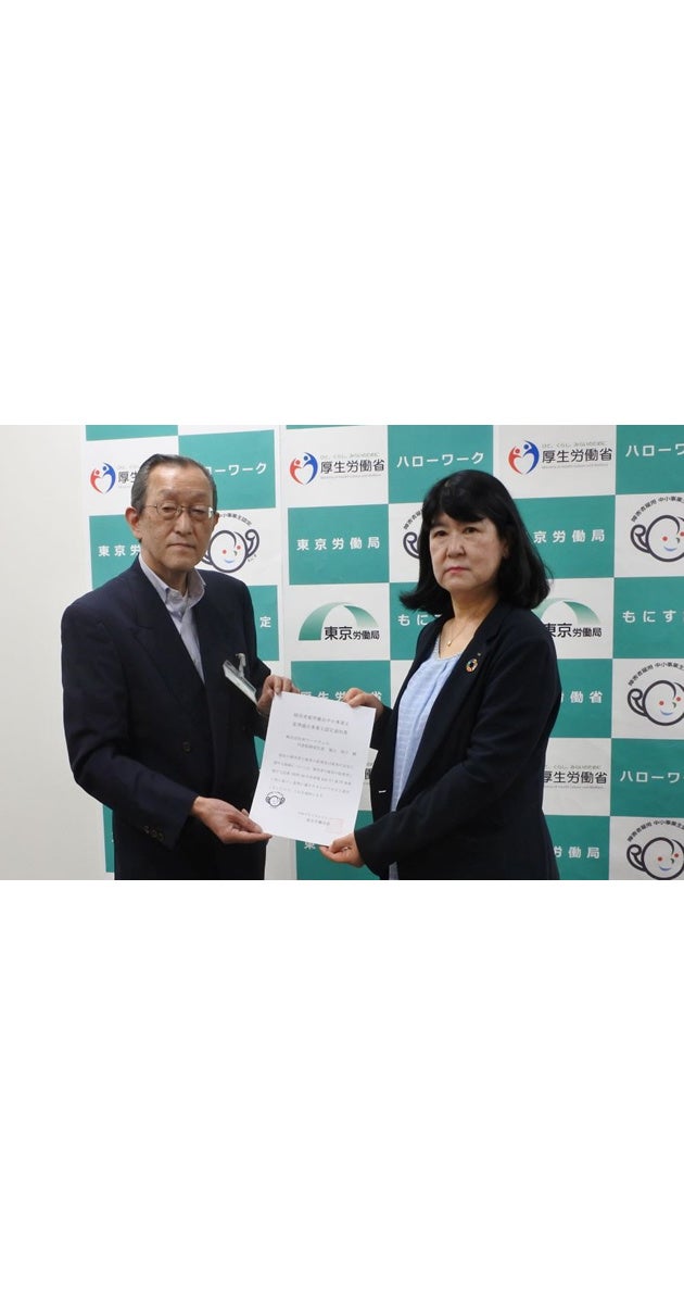 6月9日に行われた「もにす認定」授与式の様子 ハローワーク品川 赤尾所長(左)、OWW堀口社長(右)