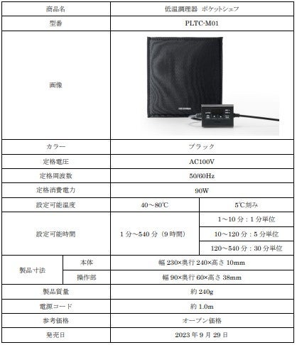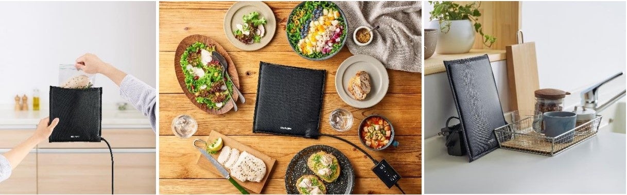 今回発売する「低温調理器 ポケットシェフ」は、耐熱袋(※1)に食材を密閉して本体にセット(※2)し、温度と時間を設定するだけで、初めての方でも手軽に低温調理(※3)できます。また、水や鍋を使用しないため、準備や片付けの時間を短縮でき、キッチンだけでなくリビングなど場所を選ばず調理できます。本体は約24㎝四方、厚さも1㎝とコンパクトで、限られたキッチンスペースにも収納できます。