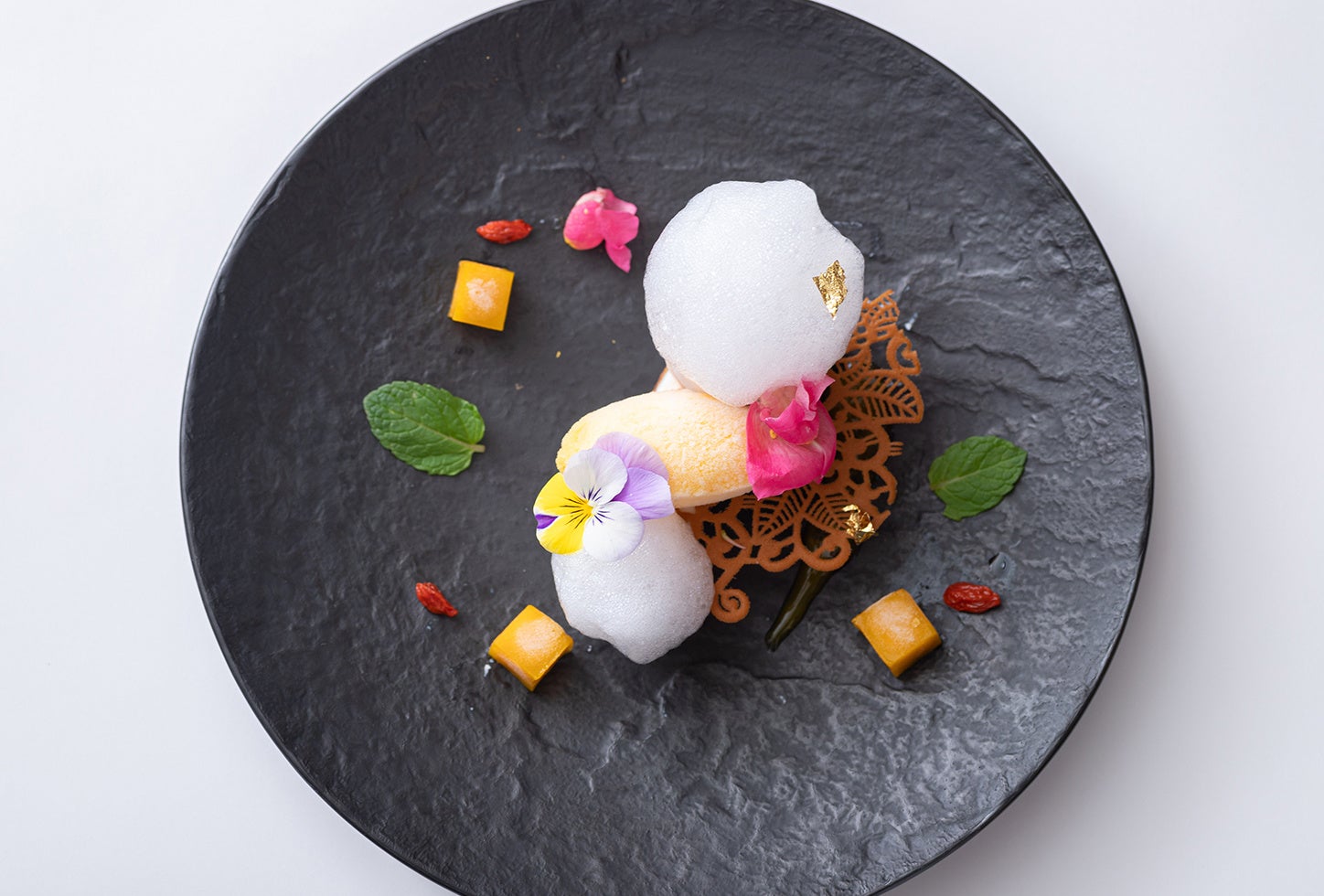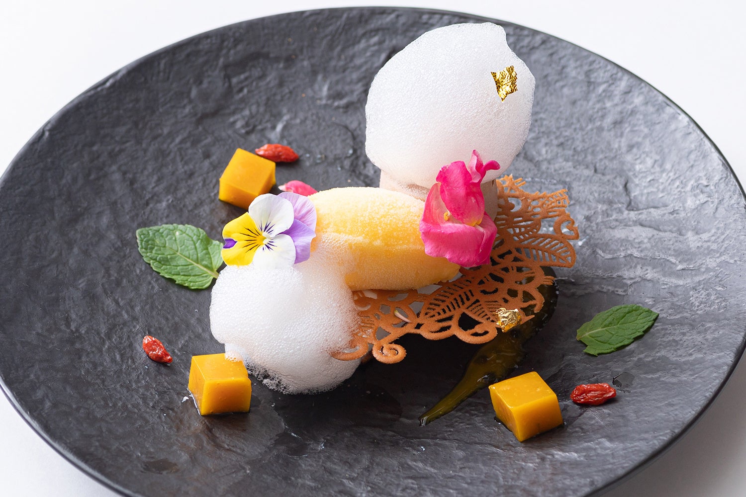 ふわふわの杏仁の泡に包まれる南国沖縄の味わいを楽しんでいただけるよう、氷菓にはパッションフルーツを使い、飾りに沖縄の伝統工芸の紅型をイメージしたクッキー生地で沖縄を表現しました。今後も沖縄の食材を多くの方に知っていただけるデザート作りをめざします。