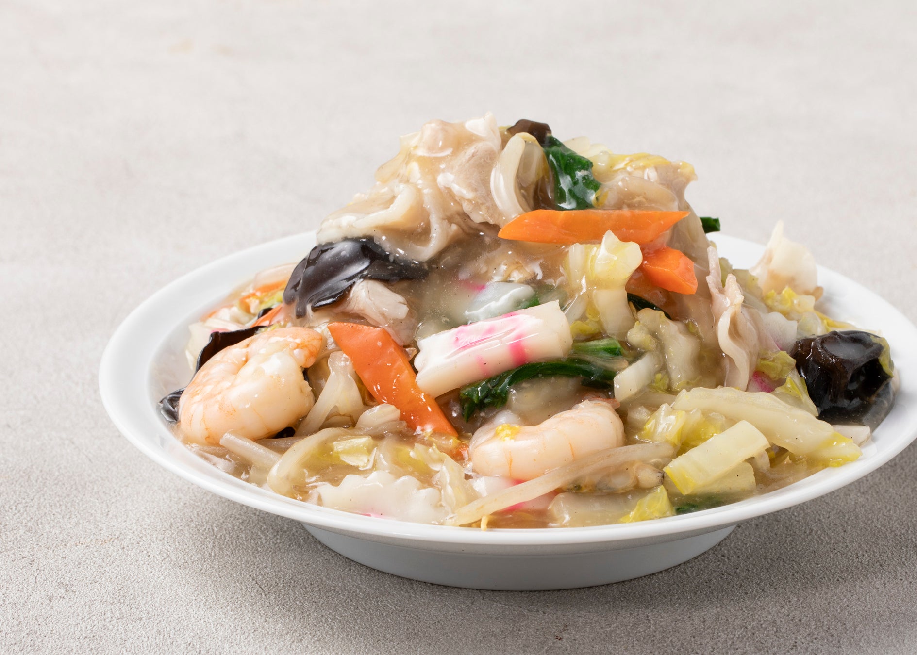 ボリューミーにたっぷり野菜餡かけの皿うどんかヘルシーにふわふわ自家製鶏焼売をチョイス!メインは「楊貴妃の愛した海老マヨネーズ」「痺れ辛い紅麻婆豆腐」「四川風特製よだれ鶏」のディナー人気メニュー3種から選べるお得なランチメニュー。