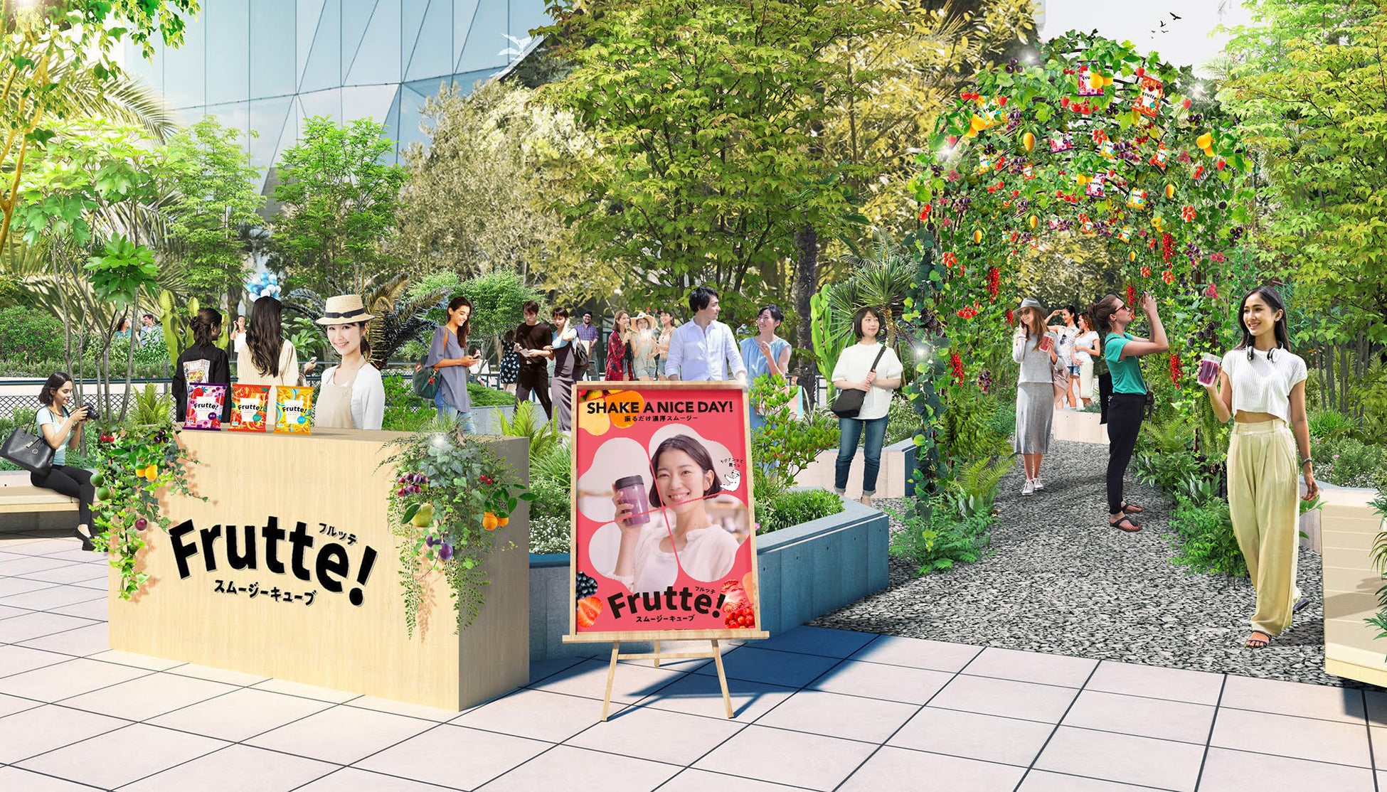 「ハラカド」のテラスで、果樹園をモチーフにしたエリアでの「Frutte!」を摘む体験や、シェイク&試飲体験、特設フォトスポットでの撮影などが無料で体験できるイベントです。