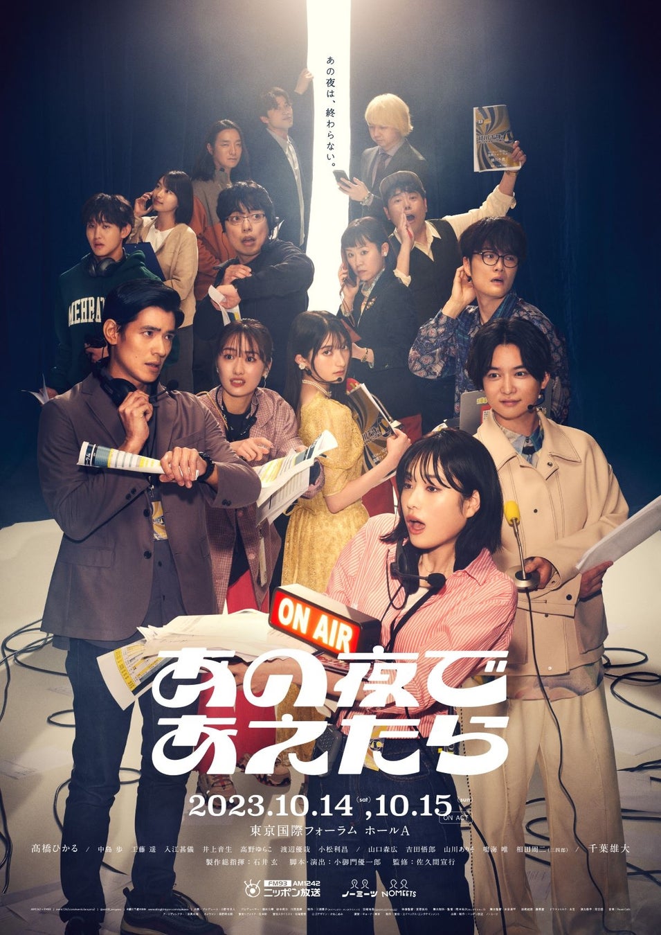 2022年3月に上演した、オールナイトニッポン55周年記念公演『あの夜を覚えてる』の続編となる、舞台演劇番組イベント生配信ドラマ『あの夜であえたら』が、2023年10月14日(土)・15日(日)、ニッポン放送を飛び出して、今度は東京国際フォーラムホールAにて会場と配信の両方で上演決定!