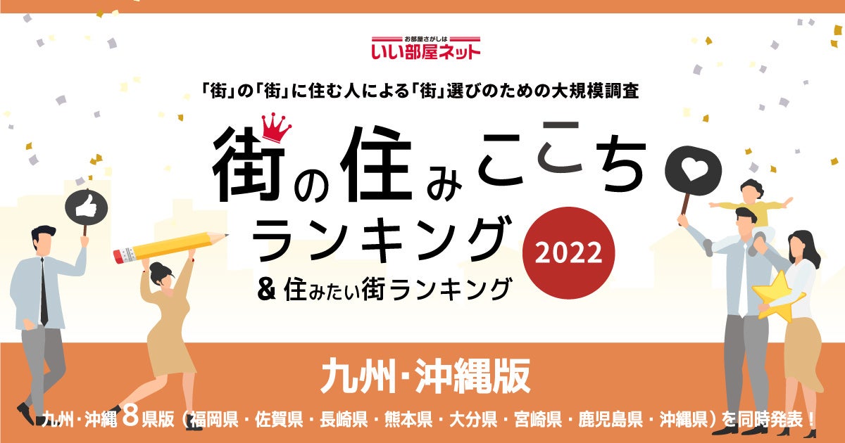 大東建託株式会社(本社:東京都港区、代表取締役社長:小林克満)は、過去最大級の居住満足度調査を行い、「いい部屋ネット 街の住みここちランキング2022<九州・沖縄版>」「いい部屋ネット 住みたい街ランキング2022<九州・沖縄版>」として集計しました。