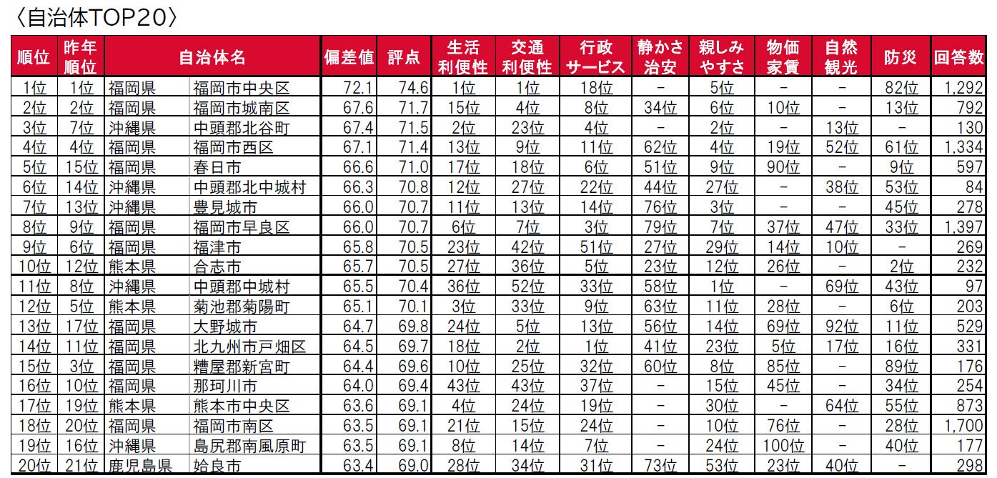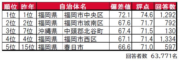 1位は3年連続で、九州北部の政治・経済の中枢である福岡県福岡市中央区です。2位は、2年連続で福岡県福岡市城南区、3位は、大規模商業施設やホテルが多数あり、観光客にも人気のある沖縄県中頭郡北谷町が昨年7位から順位を上げています。