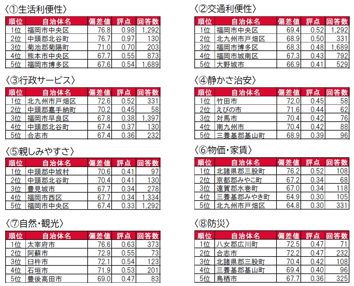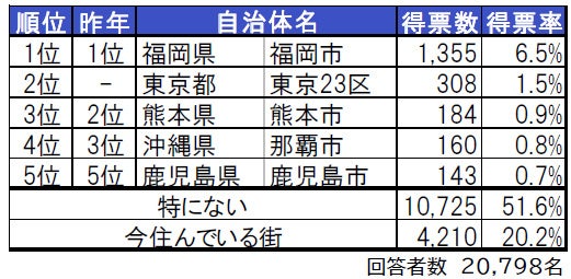 昨年は九州・沖縄内の自治体のみを対象として集計しましたが、今年は全国の自治体を対象に変更しました。しかし、1位は昨年と変わらず高い支持を得て福岡県福岡市です。2位には、東京23区が新たにランクインしています。3位~5位は、九州各県の県庁所在地(3位熊本県熊本市、4位沖縄県那覇市、5位鹿児島県鹿児島市)が並ぶ結果となっています。