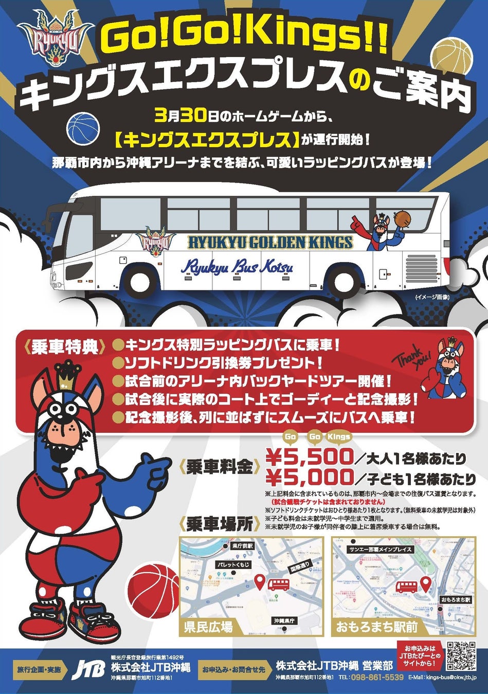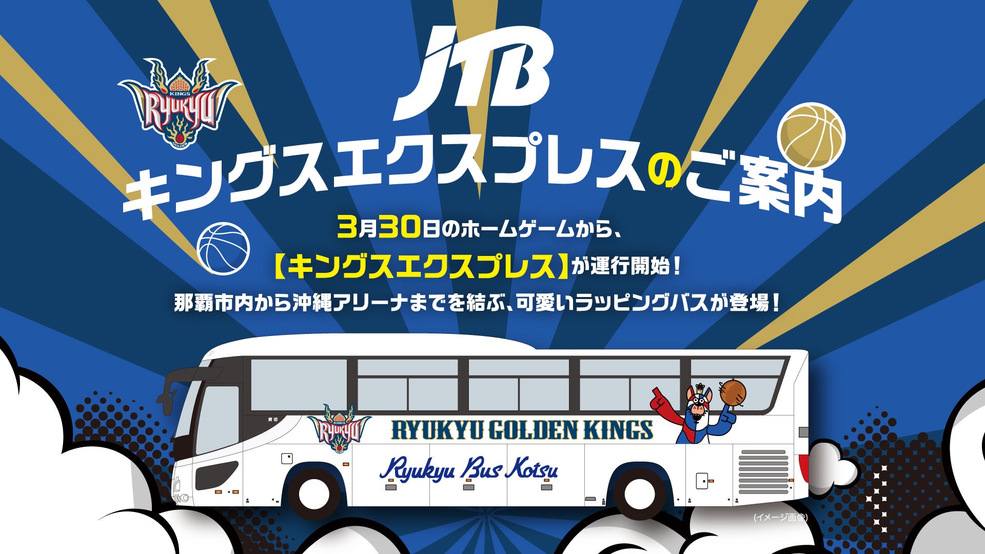 この度、琉球ゴールデンキングスのオフィシャルパートナーである株式会社JTB沖縄と共同で、那覇市内と沖縄アリーナまでを結ぶ「キングスエクスプレス」バスの販売を開始いたします。3月30日(土)茨城ロボッツ戦のキングスホームゲームから、キングス一色のラッピングバスが運行いたします。