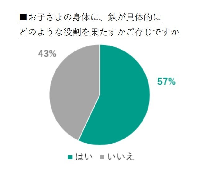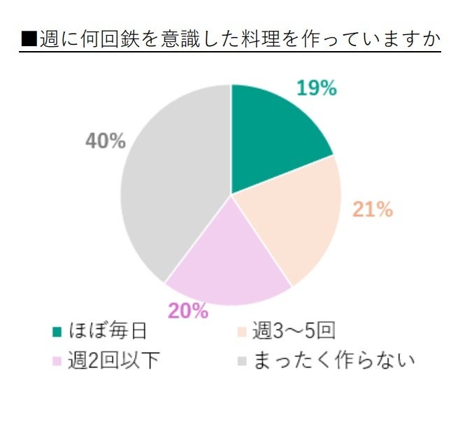 ユーグレナ社が行った調査※2によると、鉄を意識した料理を毎日作っている人はわずか2割となり、鉄がお子さまの身体に具体的にどのような役割を果たすか知らない人は4割にものぼることが明らかになりました。この結果から、鉄の重要性が十分に認識されておらず、日々の食事で意識的に摂取されていない家庭が多いことが伺えます。