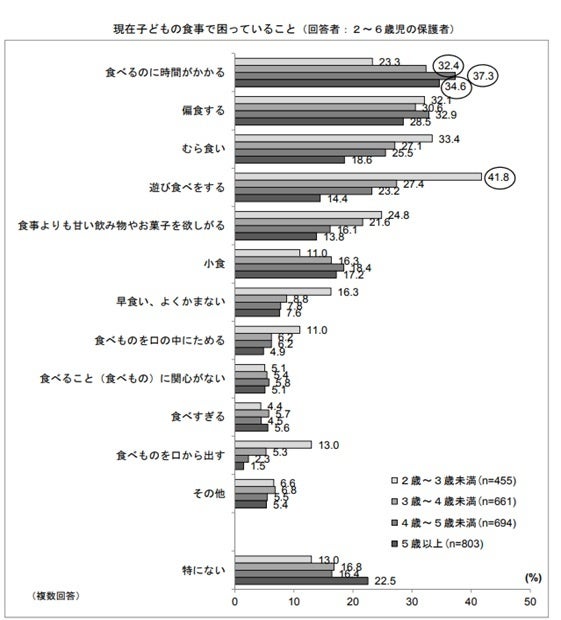 全国の乳幼児の食事状況の実態を調べた乳幼児栄養調査結果*1における、「現在の子どもの食事で困っていること」(図1)を見ると、2~3歳では「むら食い」33.4%、「遊び食べをする」41.8%、4~5歳では「偏食する」32.9%、「食べるのに時間がかかる」37.3%と、幼児期は家庭が抱える食事の悩みとして、遊び食べ、偏食、食べる時間に悩みを抱えており、子どもの気分で食事の内容や時間が左右されやすい家庭が多いことがうかがえます。日々の食事作りだけでも大変な中で、こうした要因も栄養素摂取のハードルを高くしていることが予想されます。