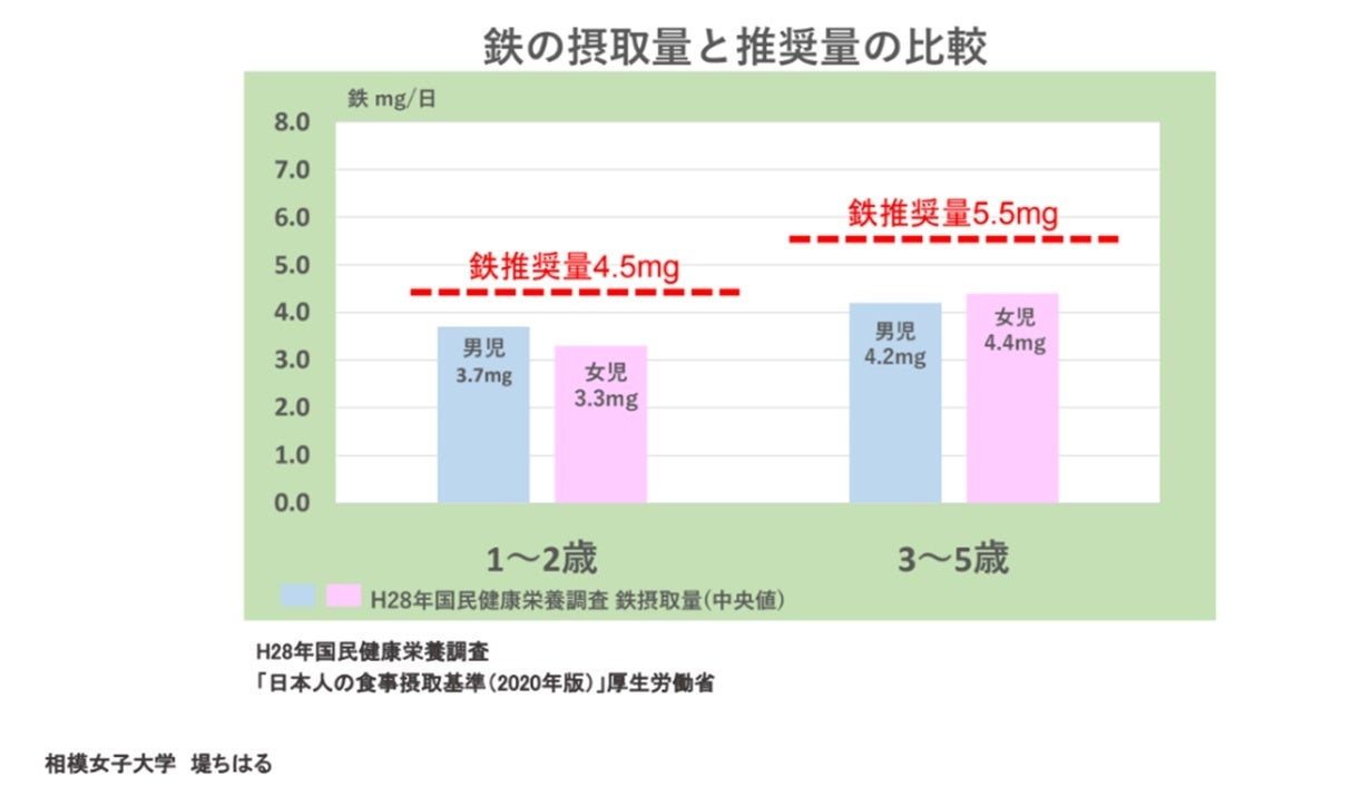また、国民健康・栄養調査*2*3*4における小児(1~5歳)の鉄摂取量を、鉄摂取の推奨量を示す食事摂取基準*5と比較すると、男児、女児共に鉄の推奨量を満たしていないことが見て取れます。