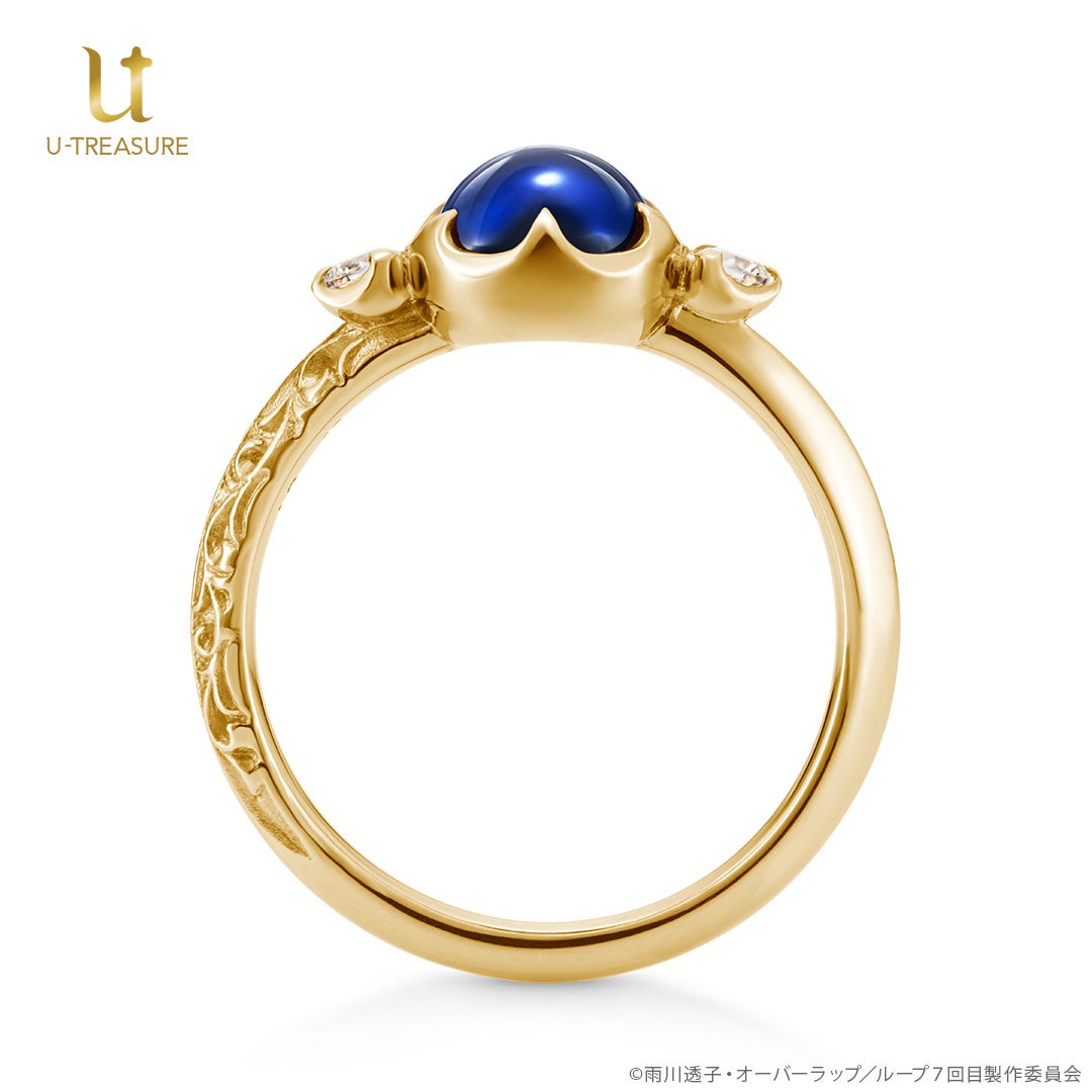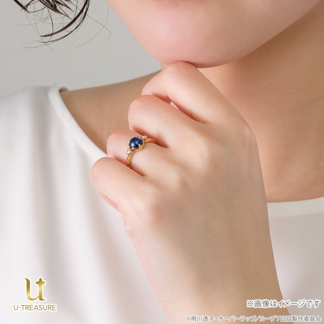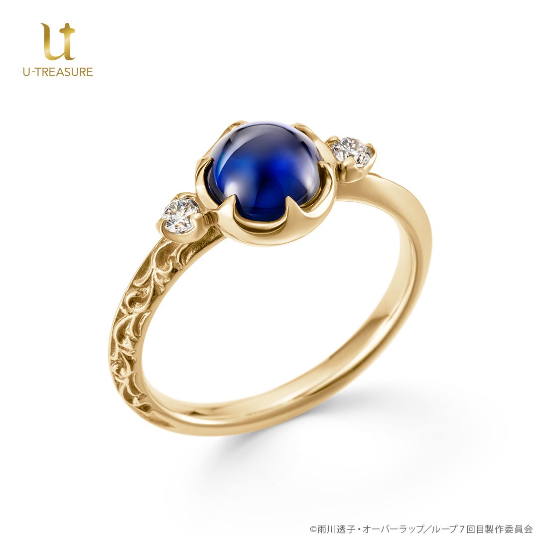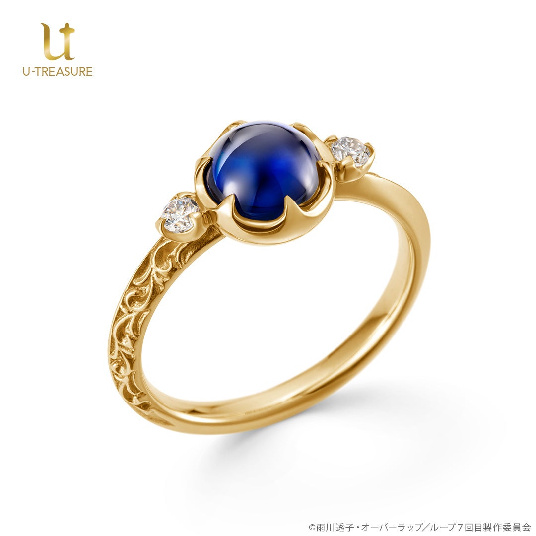 このたびの新作は、『アルノルト・ハイン』が主人公『リーシェ・イルムガルド・ヴェルツナー』に贈った婚約指輪を公式監修のもとデザイン設定を参考に忠実に再現したリング(指輪)です。センターストーンは『アルノルト』の青い瞳の色を表現するため、今回オリジナルの合成サファイアの作製を行いました。リングのケースまでデザイン設定に沿った特別な逸品です。