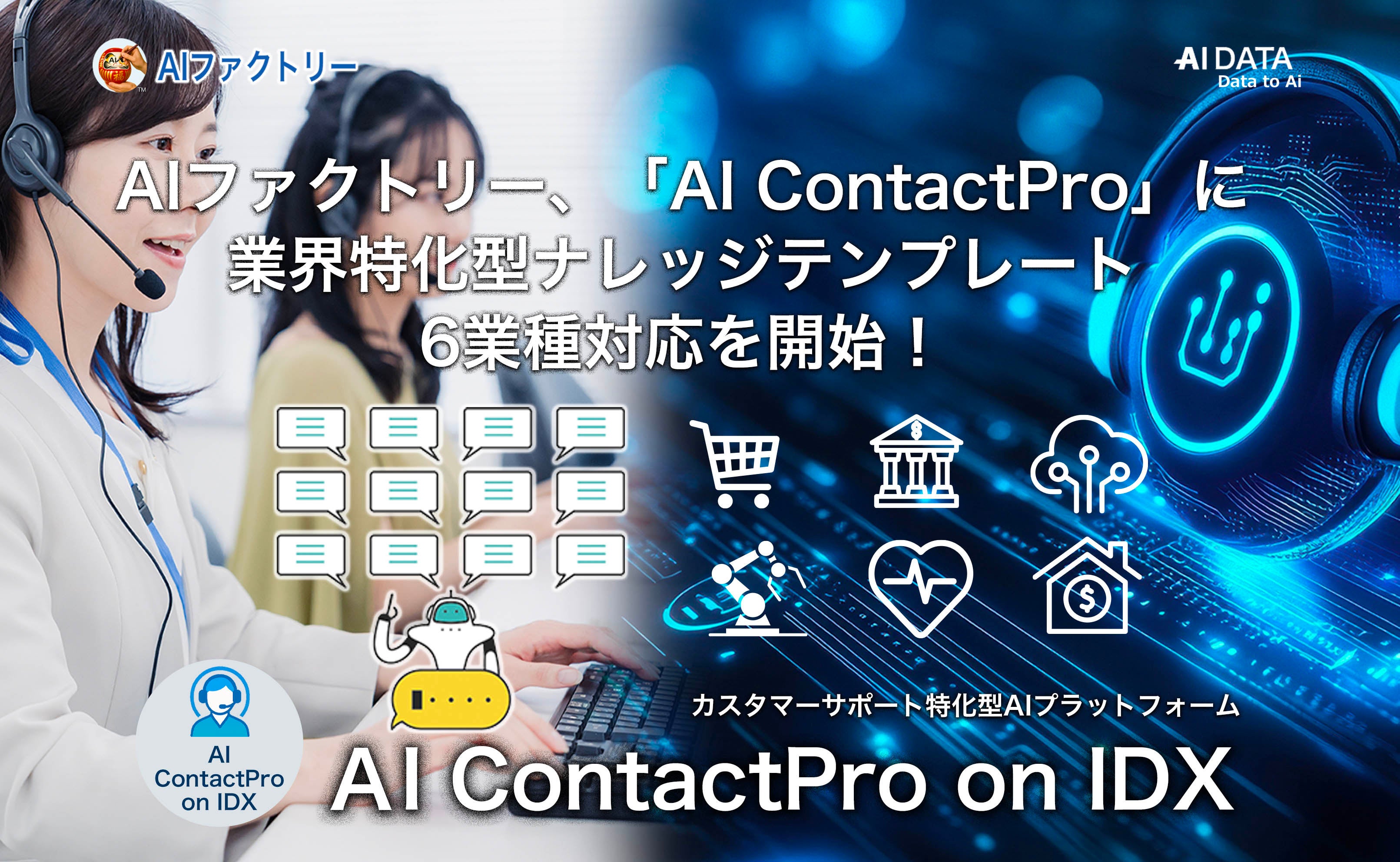 AIファクトリー「AI ContactPro」に業界特化型ナレッジテンプレート6業種対応を開始! 〜 金融・通信・小売・製造・医療・不動産業界の専門知識を標準搭載で回答精度の向上を目指す〜