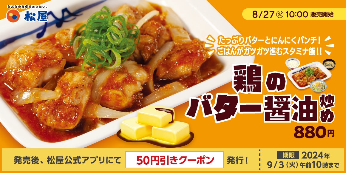 このたび松屋フーズ(本社:東京都武蔵野市、代表取締役社長:瓦葺一利)では、牛めし・カレー・定食・その他丼の「松屋」におきまして、2024年8月27日(火)10時より「鶏のバター醬油炒め定食」を販売いたします。