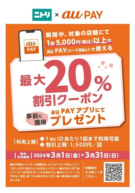 株式会社ニトリホールディングス(本社:札幌市北区 代表取締役社長:白井俊之 以下:ニトリ)は、所定の金額に達した為「au PAYクーポン」を終了させていただきます。