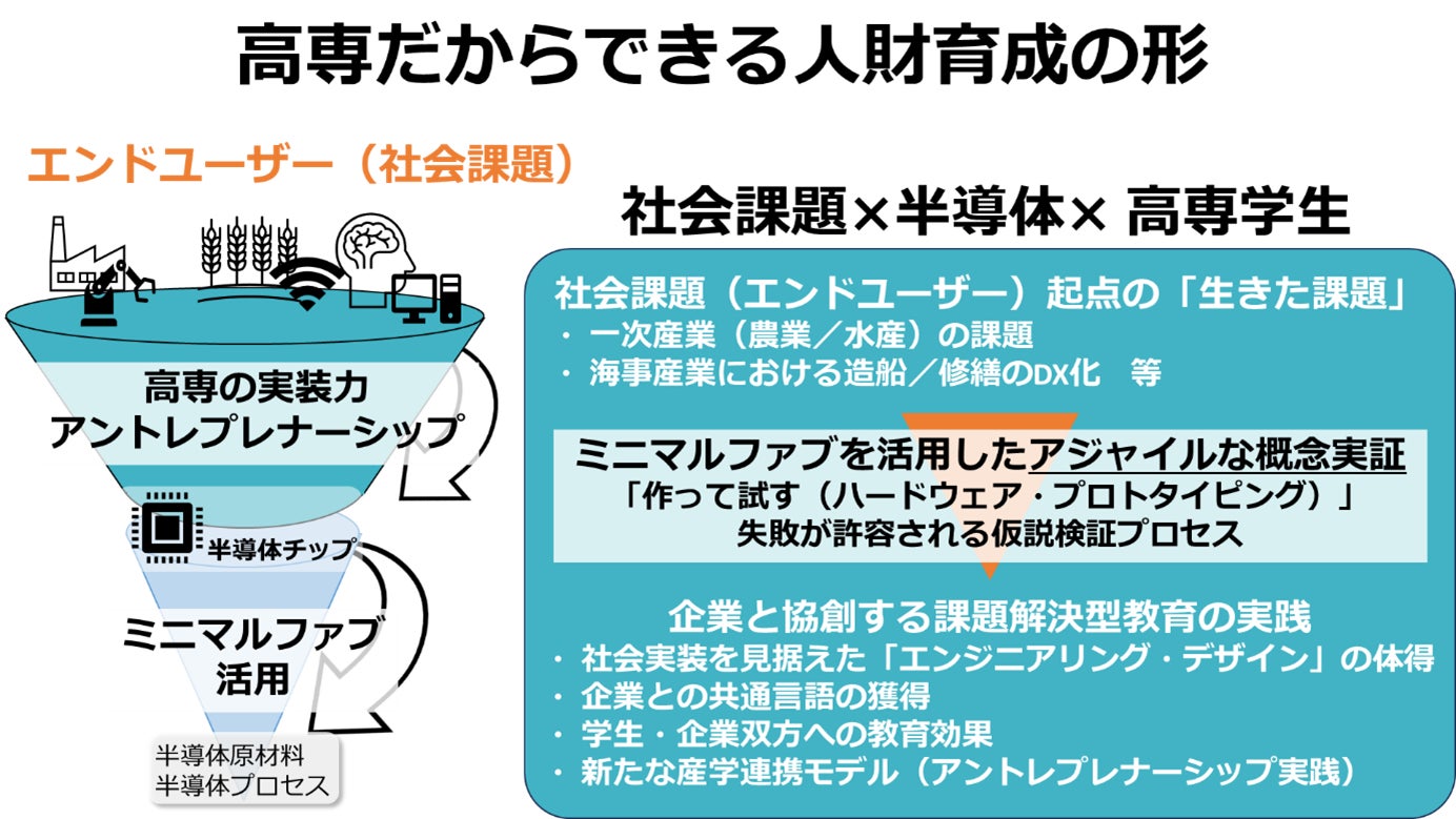 高専機構が蓄積してきた半導体教育のノウハウや実験設備の活用例、産学官金連携の事例を集約し全国へ波及させる中核拠点として佐世保高専が機能することで、組織的・戦略的に推進できる体制へと進化します。