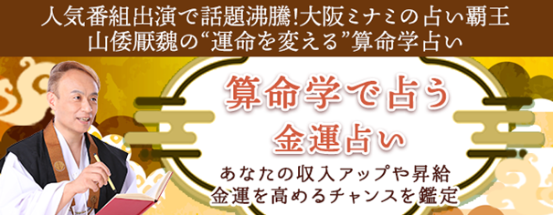 大阪ミナミの占い覇王として数々の番組やメディアで人気を博している山倭厭魏(やまとおうぎ)による本格算命学サイト『山倭厭魏の算命学』にて、この度『算命学で占う金運占い』を無料公開いたしました。生年月日を入力するだけで、あなたの収入アップや昇給・金運を高めるチャンスや開運法まで詳細に鑑定することができます。