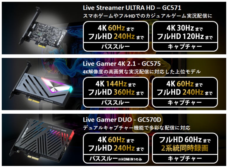 用途に合わせてお選びいただける3種類のキャプチャーボードをご用意