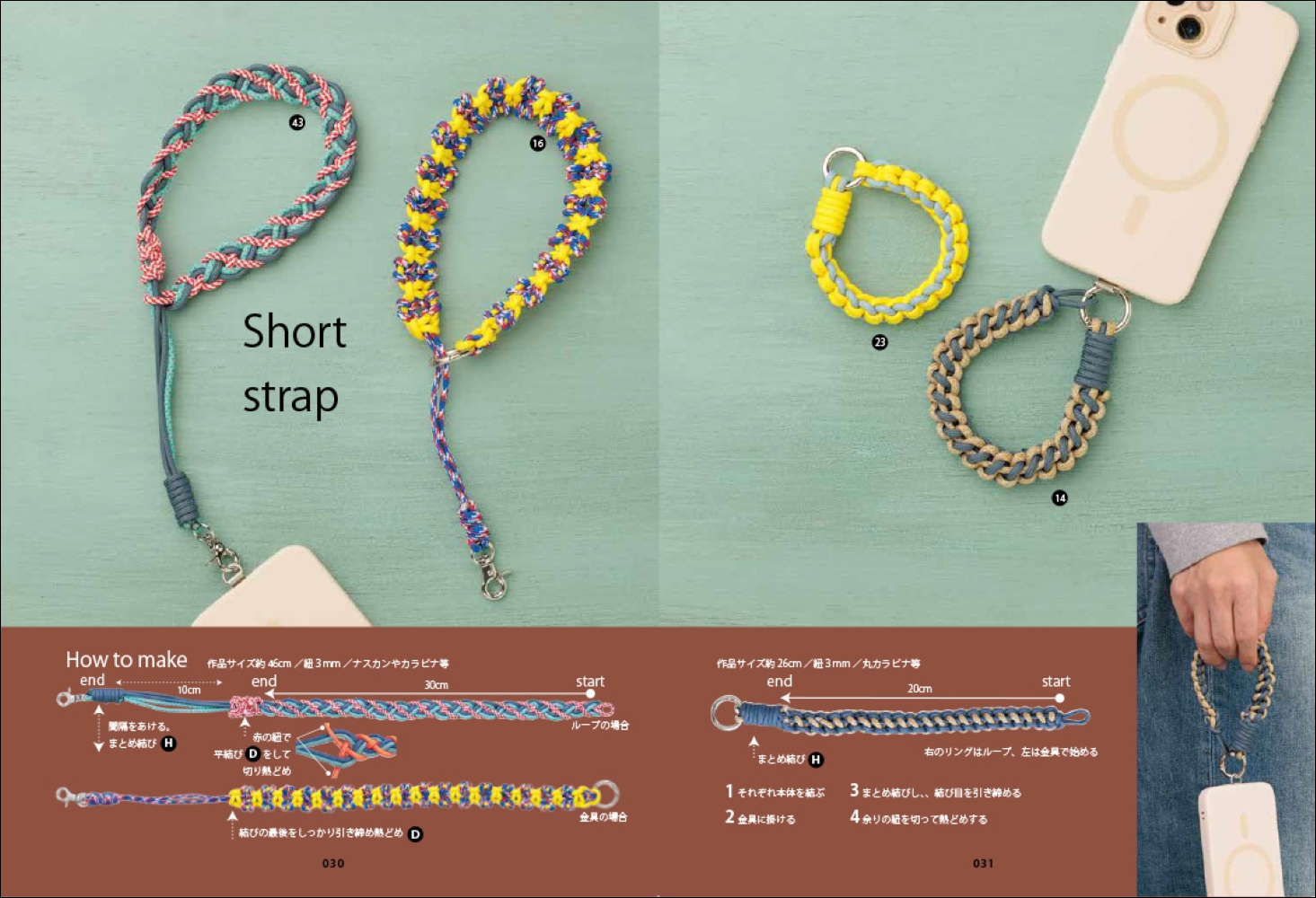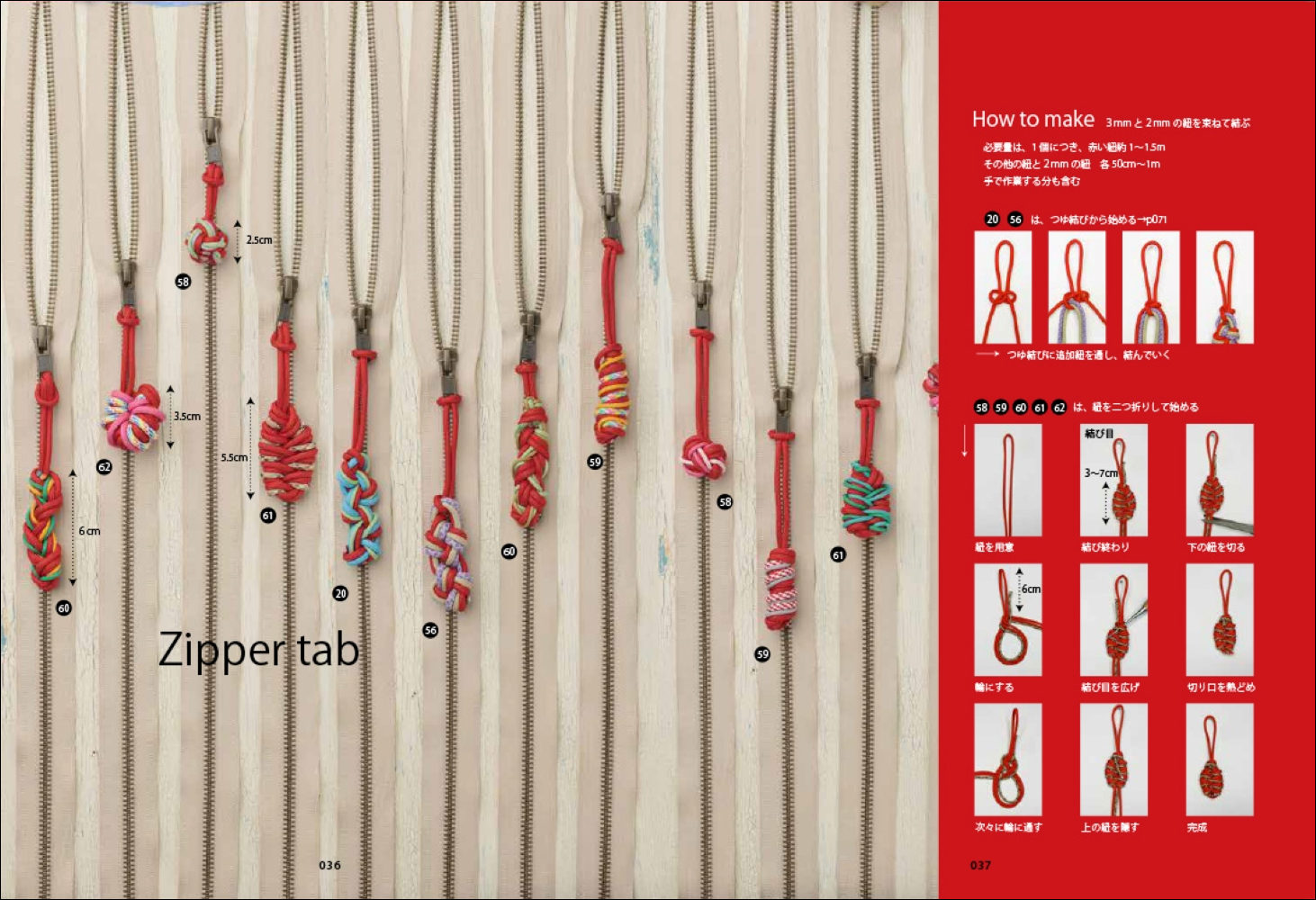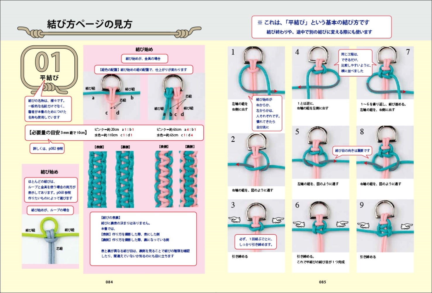 結び方ページの見方/中央で結ぶ/ビーズ使いのハンドルストラップ/ひと巻きする/タッチング結び/交差させる/伝統結び他
