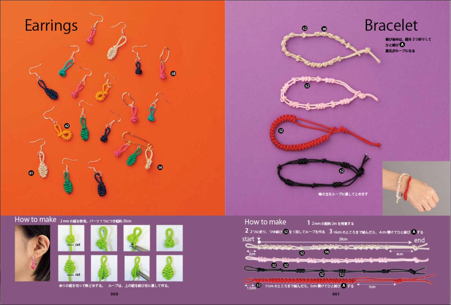 用具について/紐を繋ぐ紐端をとめる/結びはじめ/長さを決めて結ぶ/結び終わりを束ねる/結び終わりを切る/まとめ結び-結び終わり/途中のまとめ結び/結び始めのまとめ結び/紐を長く巻きつける/真中で結び分ける/アクセサリーの作り方