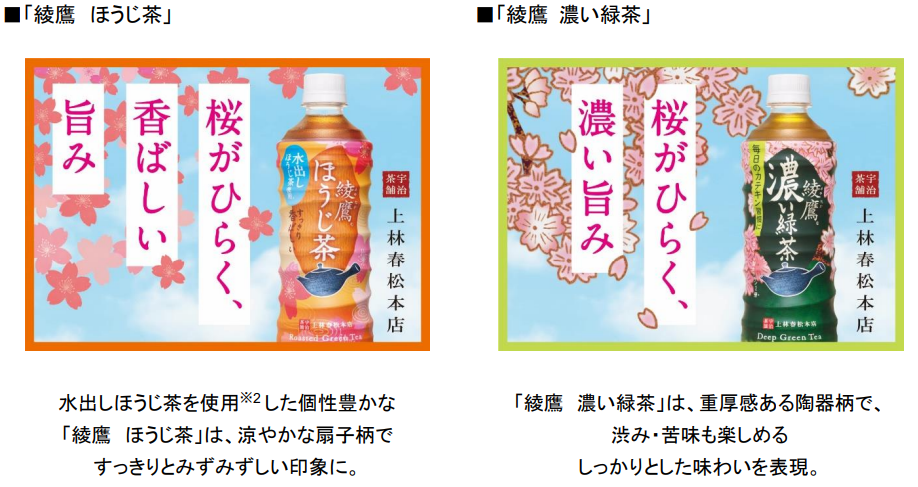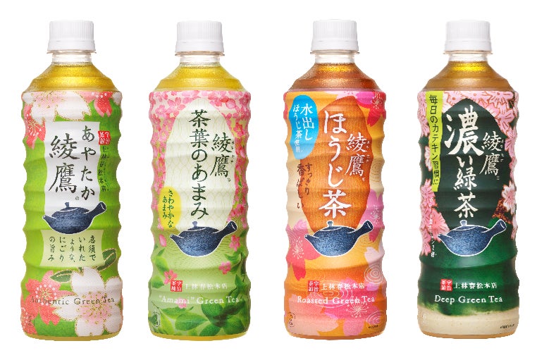 「綾鷹 桜デザインボトル」は、桜の季節にぴったりなデザインで、春の食事やお出かけを彩り、まるでお花見をしているような華やかな気分を演出します。4種類のパッケージデザインには、「綾鷹」=織物柄、「綾鷹 茶葉のあまみ」=水彩柄、「綾鷹 ほうじ茶」=扇子柄、「綾鷹 濃い緑茶」=陶器柄など、それぞれの味わいのイメージにあった和素材の“桜”が描かれ、全種類揃えたくなるような上品で華やかなデザインに仕上がっています。