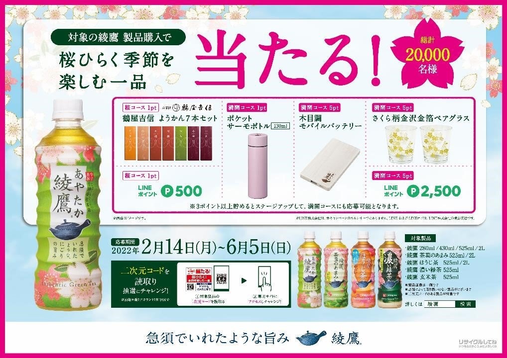「綾鷹 桜デザインボトル」発売を記念して、2月14日(月)から抽選で20,000名様に「桜ひらく季節を楽しむ一品」が当たるプレゼントキャンペーンを実施します。購入した本数に応じて、桜の季節にぴったりなサーモボトルやお花見スイーツが当たる「桜コース」、木目調のモバイルバッテリーや金箔をあしらったペアグラスが当たる「満開コース」に応募いただけます。