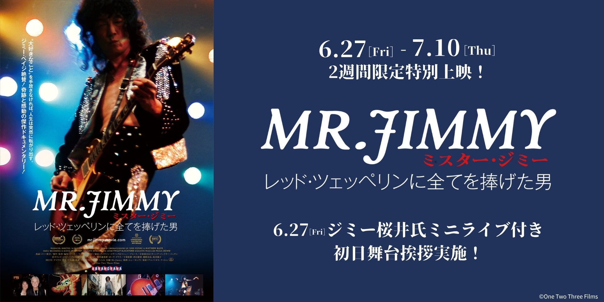 ギタリスト・ジミー桜井氏を追ったドキュメンタリー映画『MR.JIMMY ミスター・ジミー レッド・ツェッペリンに全てを捧げた男』の豪華限定版ブルーレイ『GOOD TIME EDITION』の発売を記念し、ジミー桜井氏本人が登壇しミニライブと舞台挨拶を行う特別上映を実施します。さらにその後2週間限定で本作品を上映します。