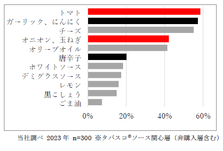 認知・市場規模ともに高水準であり、間口拡大に大きなチャンスがある「タバスコⓇソース」に着目しました。また、「タバスコⓇソース」と相性が良い食材として「トマト」や「にんにく」「玉ねぎ」が挙げられています。