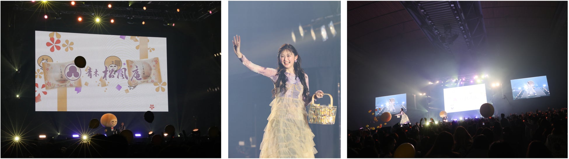 今年2024年で創業40周年を迎え、大阪土産の定番にもなっている青木松風庵のみるく饅頭「月化粧」のステージには、ゆうちゃみ、そして月化粧の公式キャラクター「つきろーくん」が登場!抜群のスタイルを持つゆうちゃみが圧巻のランウェイウォークを披露する中、置いてかれまいと必死に追いかける「つきろーくん」の可愛らしい姿にほっこり。ゆうちゃみは、累計販売個数1億2,000万個超えを誇る青木松風庵の人気ナンバーワン商品「月化粧」のTGC和歌山限定パッケージを、ランウェイ上からお客様にプレゼントしました!さらに、客席には月化粧をイメージした巨大バルーンが出現!会場が「月化粧」一色に染まりました。