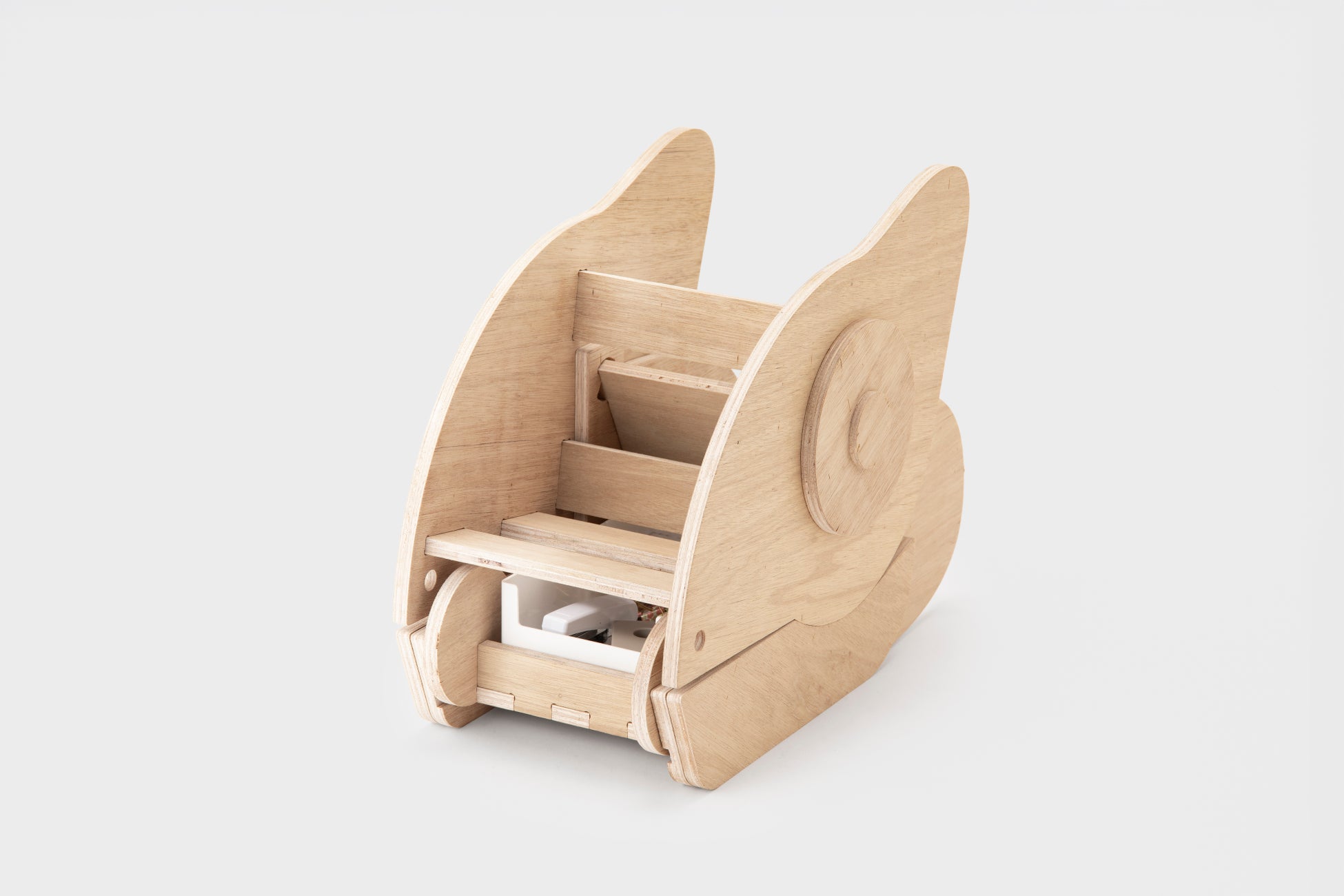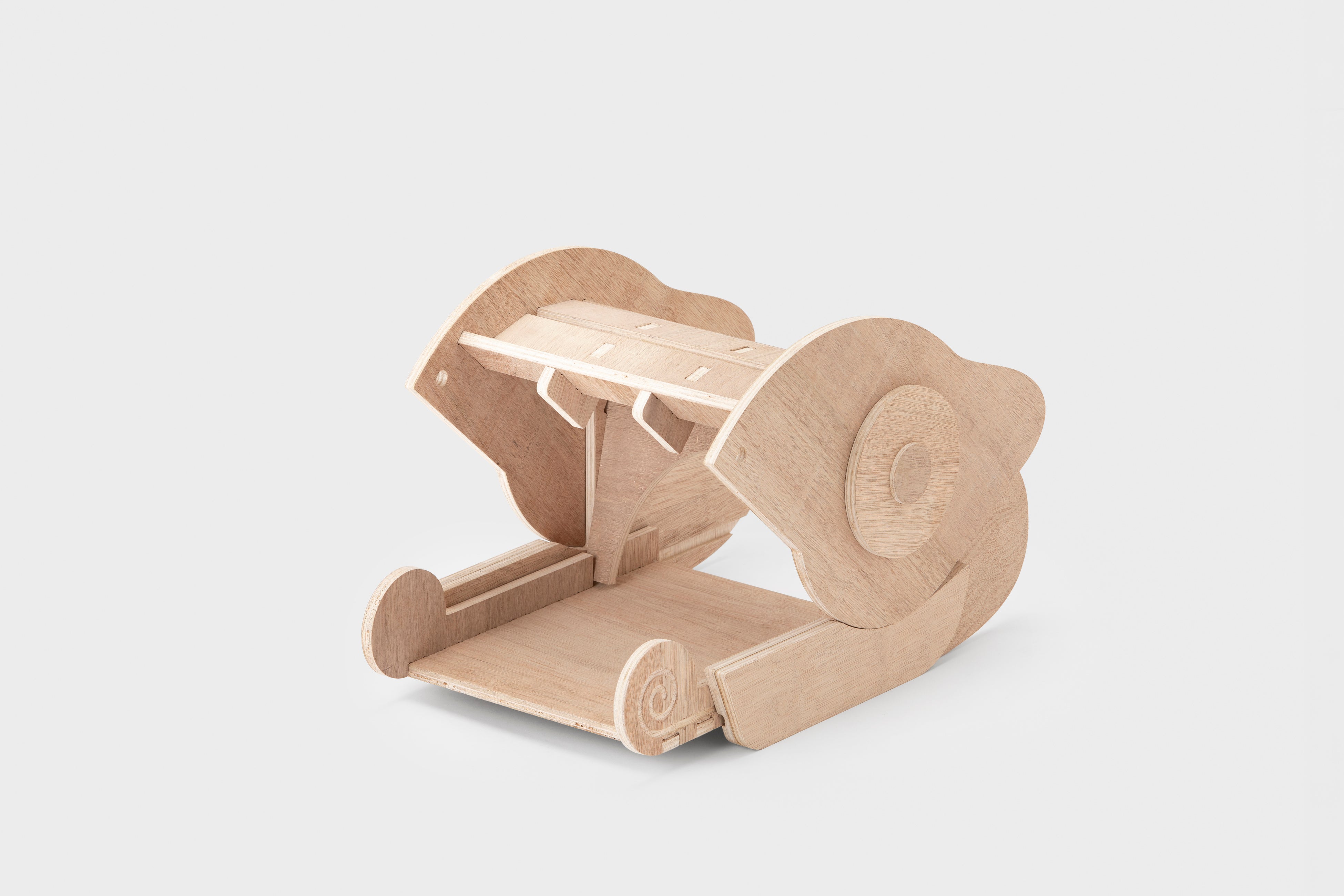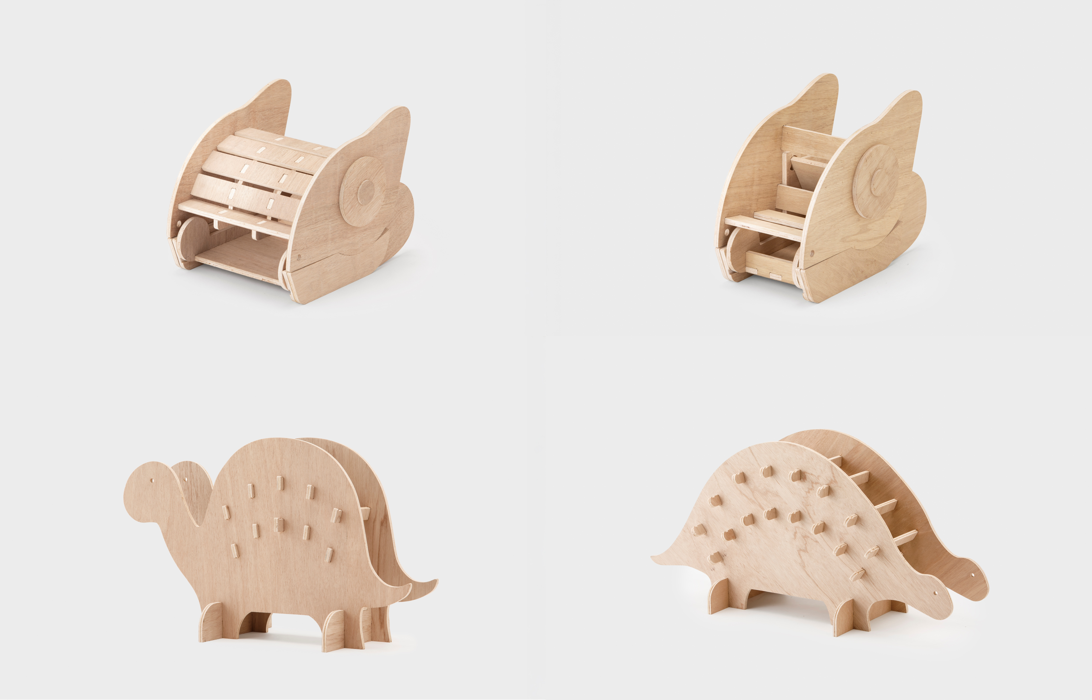 本プロジェクトは、「オフィスに棲まう動物たち」というテーマで、ShopBotを活用したデザインプロトタイピングを通して、アイデアを社会に届けるプロセスを体験すると同時に、オフィスという身近な作業環境に潜む行為や関係性を丁寧に分析、デザインする機会となりました。ShopBotの特性を活かした自由度の高い加工により発想を具体化し、日常のオフィス風景を少しユニークにデザインするプロダクトを提案しています。サウルスの傘立ては、十分な収納力と傘を幾つ入れても可愛く見える佇まいによって雨の日の気分を和らげる魅力があります。また、カメレオンのフットレストは、足置きと靴収納を兼ね備え、省スペースでの実用性と意外にニーズのある仕事中下足の癒し効果が共存している点が特徴です。本提案が今後のオフィス風景のデザイン視点からの広がりにつながることを期待しています。