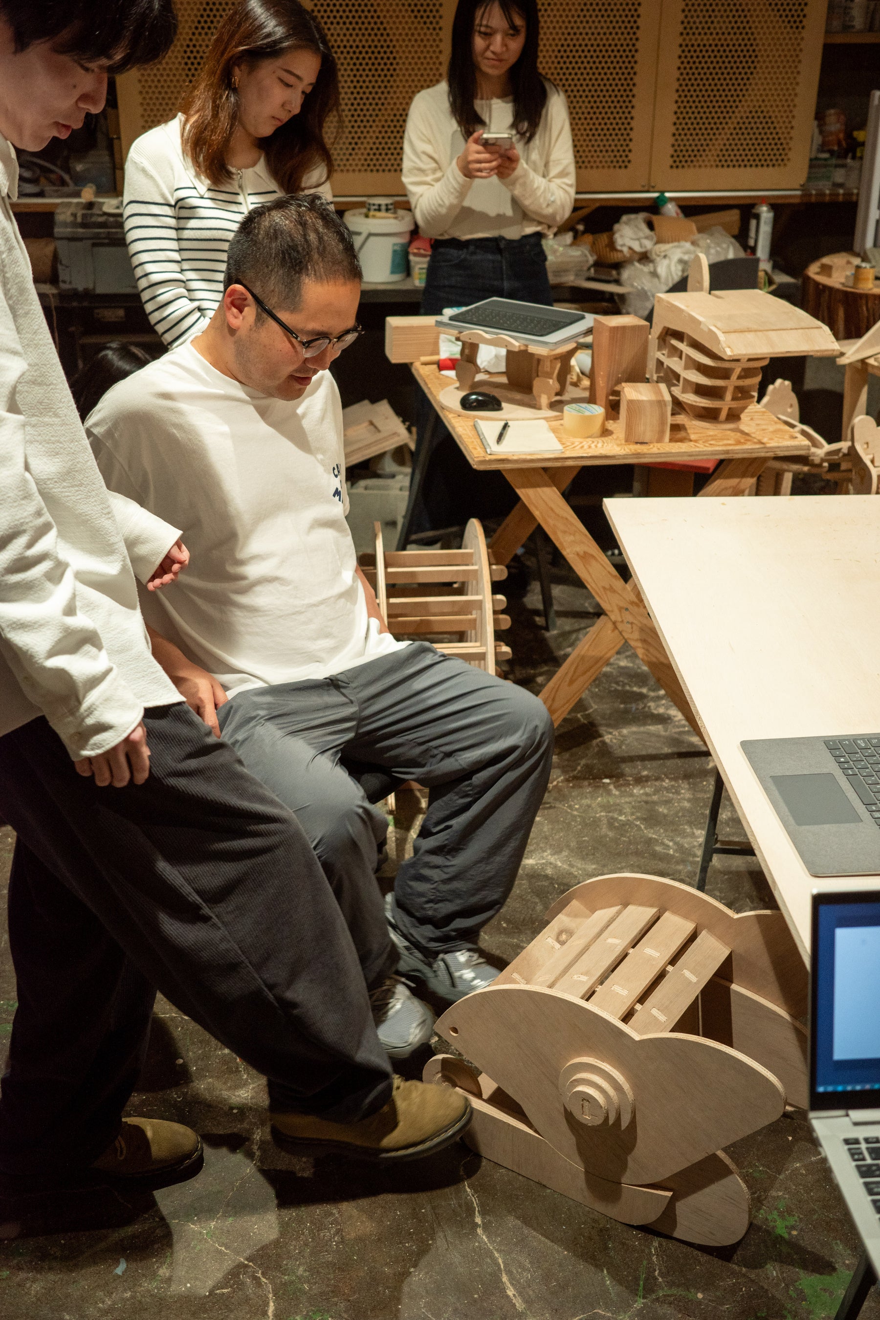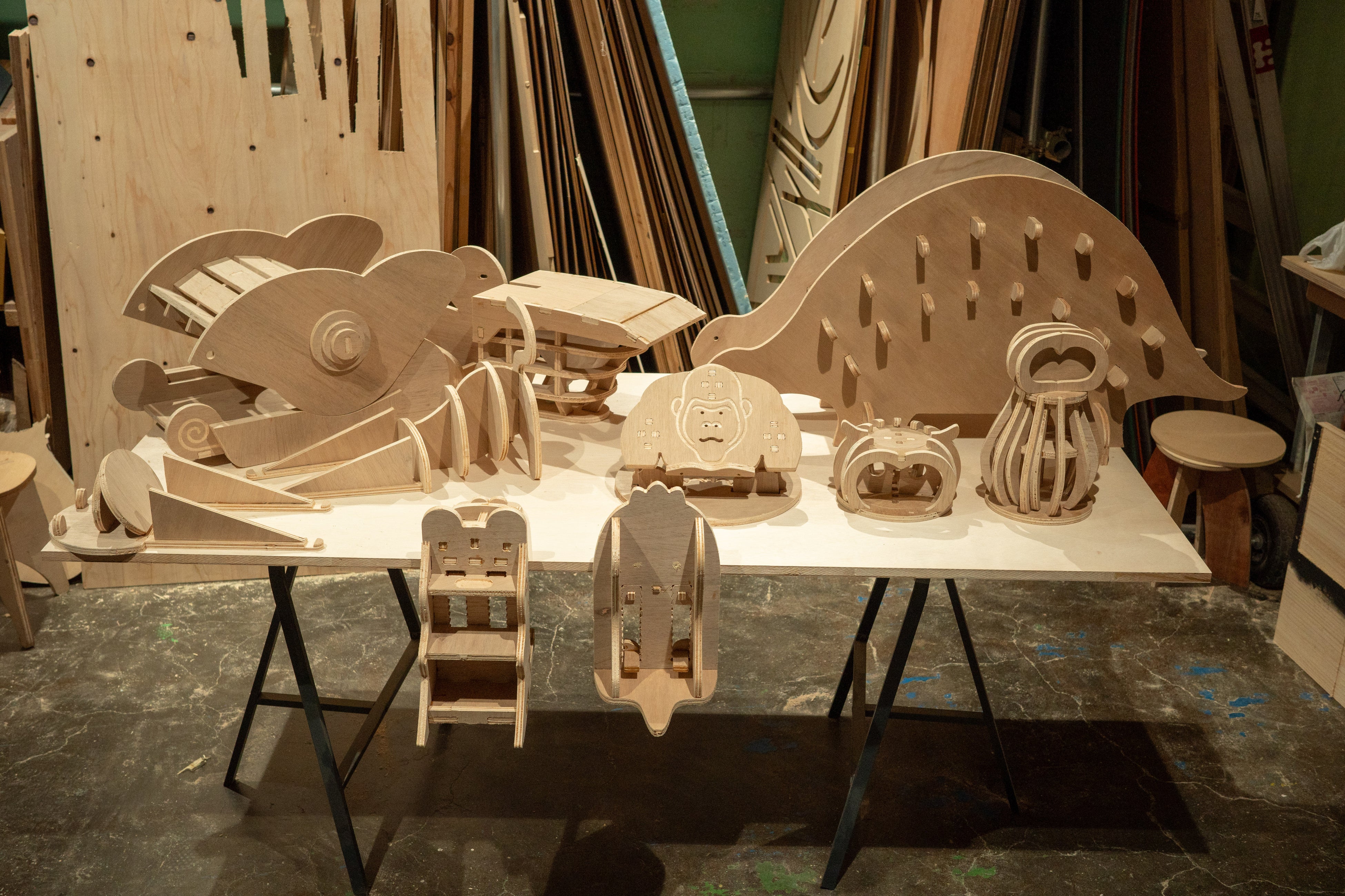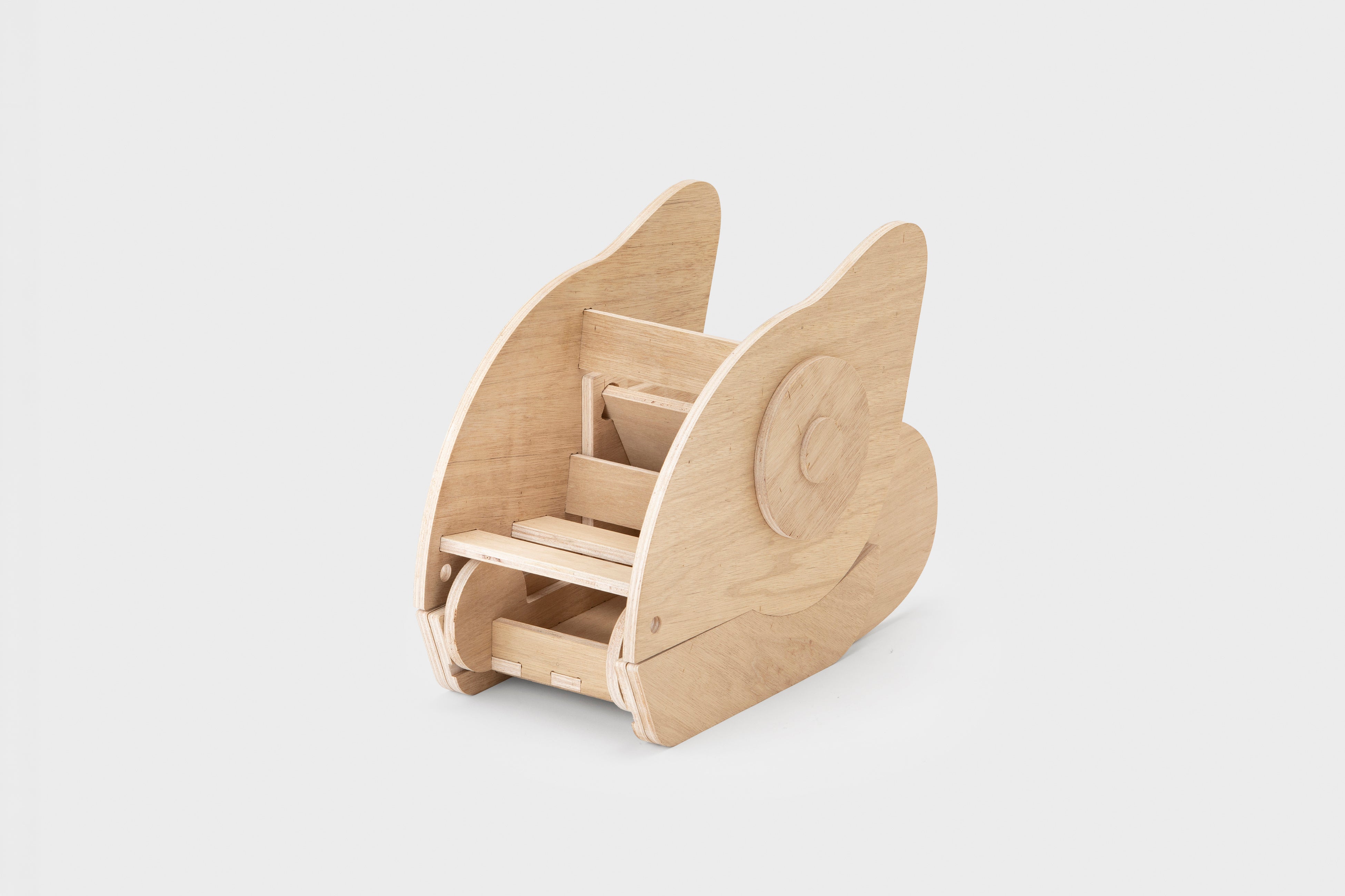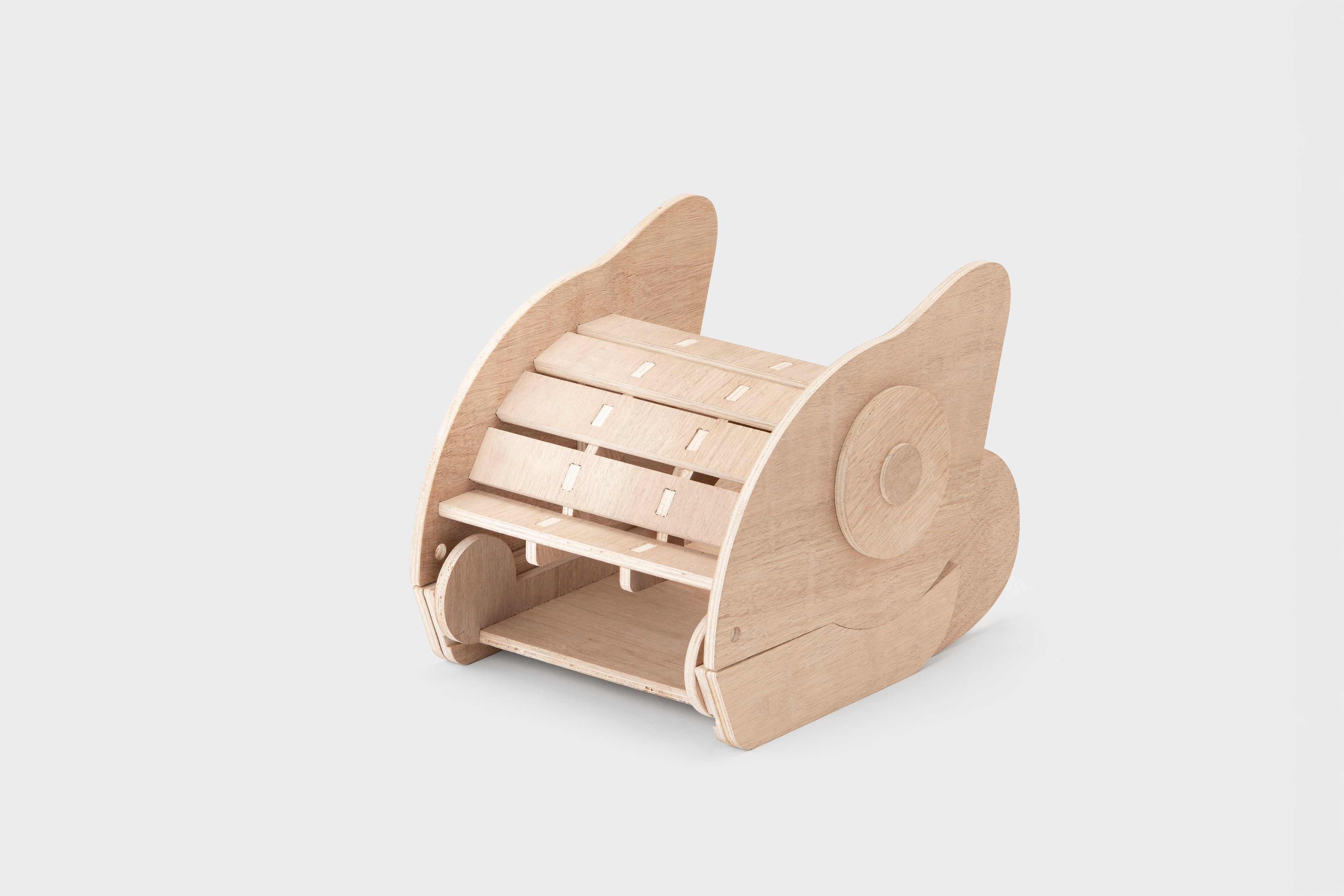 本プロジェクトは、「オフィスに棲まう動物たち」というテーマで、ShopBotを活用したデザインプロトタイピングを通して、アイデアを社会に届けるプロセスを体験すると同時に、オフィスという身近な作業環境に潜む行為や関係性を丁寧に分析、デザインする機会となりました。ShopBotの特性を活かした自由度の高い加工により発想を具体化し、日常のオフィス風景を少しユニークにデザインするプロダクトを提案しています。サウルスの傘立ては、十分な収納力と傘を幾つ入れても可愛く見える佇まいによって雨の日の気分を和らげる魅力があります。また、カメレオンのフットレストは、足置きと靴収納を兼ね備え、省スペースでの実用性と意外にニーズのある仕事中下足の癒し効果が共存している点が特徴です。本提案が今後のオフィス風景のデザイン視点からの広がりにつながることを期待しています。