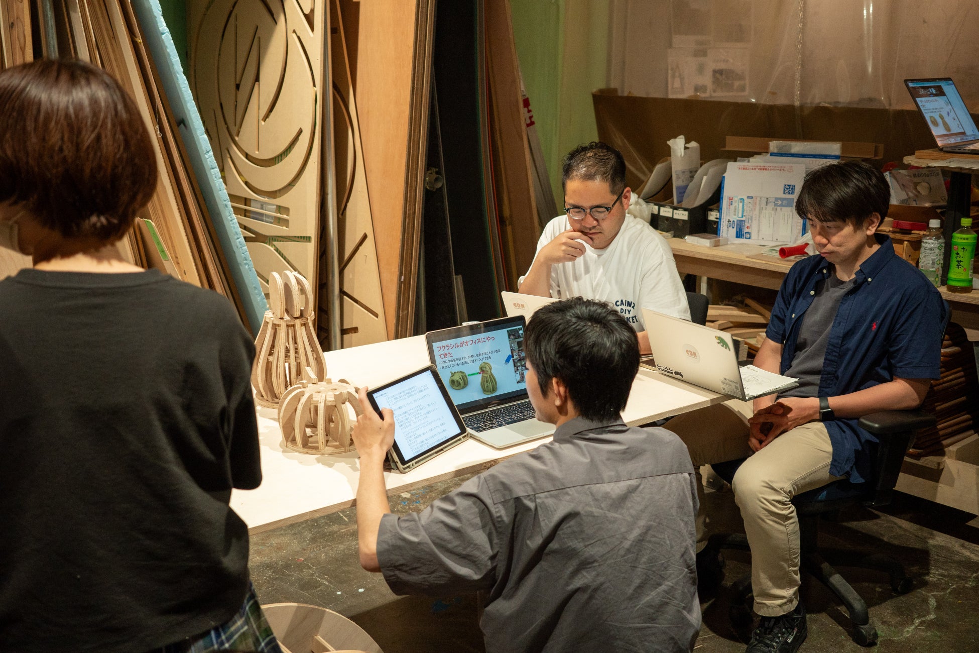今回のカインズとの取り組みは、「CAINZ×Zoo」というテーマのもと、オフィス空間に動物が潜むようなインテリアを提案するプロジェクトでした。チームでアイデアを出し合いながら、使いやすさと遊び心の両立を目指して試行錯誤を重ねました。また、ShopBotの加工技術を活かせるデザインとすることを前提に、メンバーそれぞれが工夫を重ね、サウルスでは機能性と癒しの魅力を、カメレオンでは収納力と快適性を兼ね備えた提案を生み出しました。例えば、サウルスの傘立ては背中に傘を差し込めるだけでなく、側面の横棒に窪みを設けることで折り畳み傘も掛けられるよう工夫しています。また、カメレオンの家具はサイズ違いの2種類があり、それぞれ収納できるものは異なりますが、顔を兄弟のようにデザインすることで、揃えて使いたくなる関係性を持たせています。働く日常の中にちょっとした楽しさや発見を生み出すことを目指し、ユーモアのある家具へと展開しています。