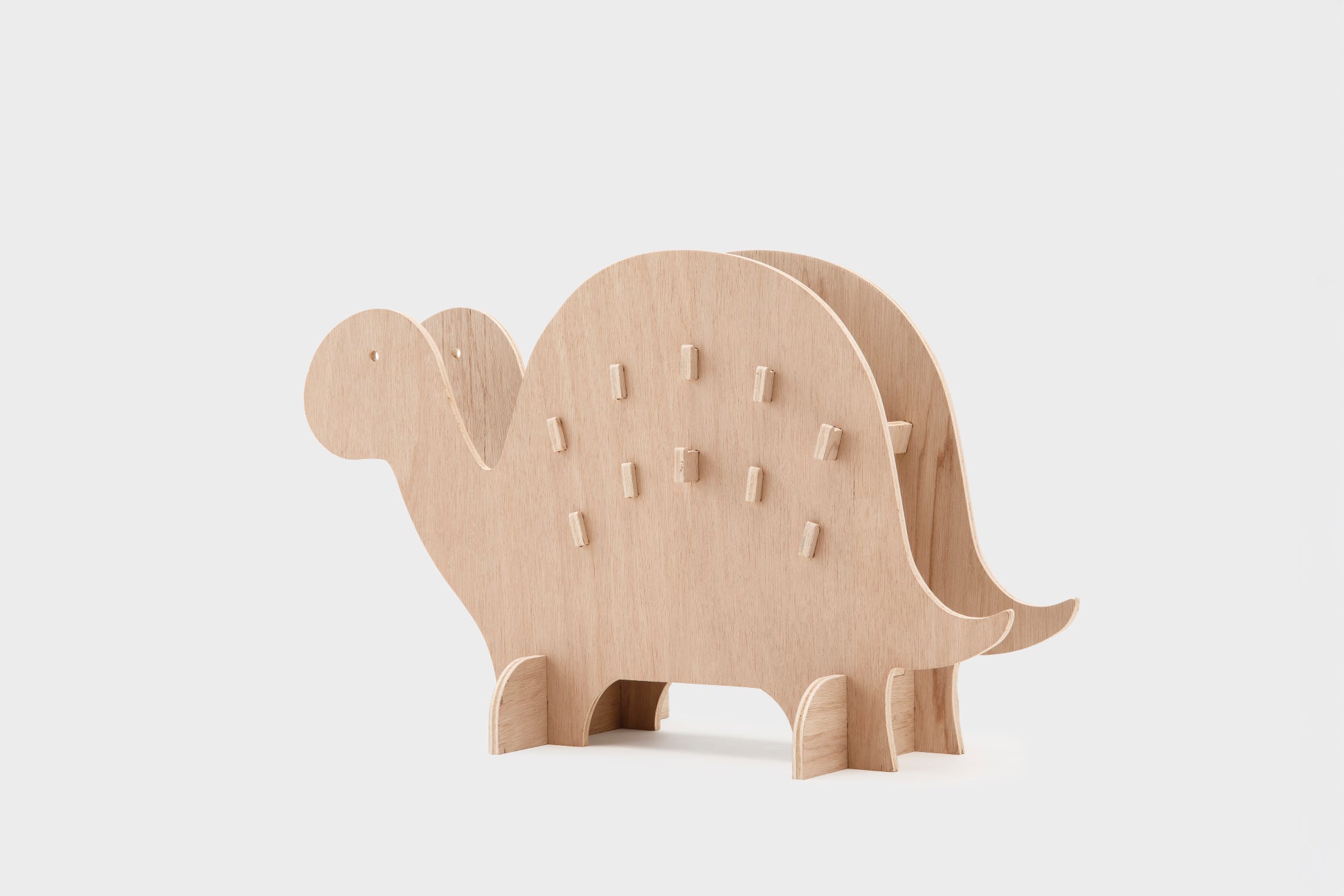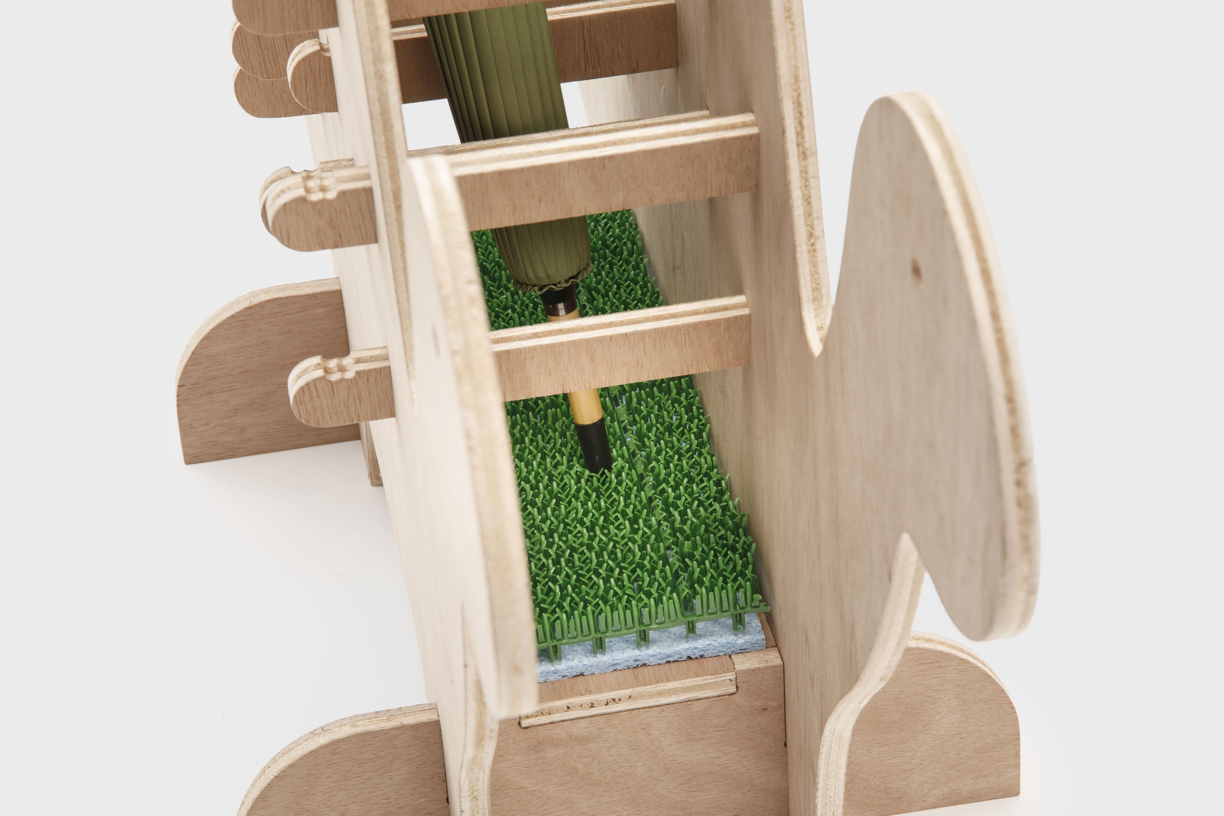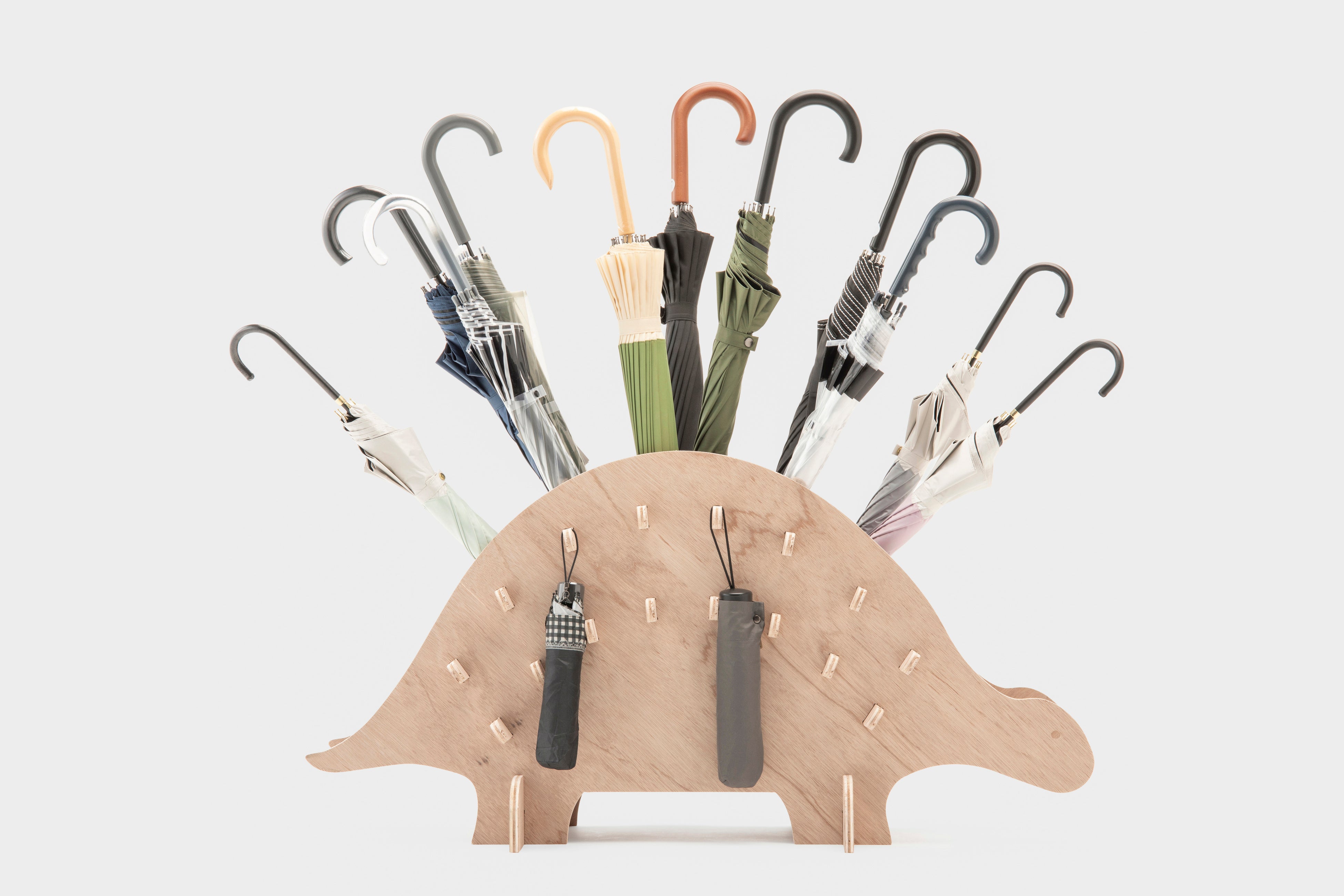 雨の日、ひょっこり現れるのは…カサを背負った恐竜です。入口のすみっこで、今日も静かにあなたの傘をお預かりします。ちょっと憂うつな雨の日も、サウルスたちがいれば少しハッピーになるかもしれません。背中には約30本の傘をしっかり収納します。置く場所の雰囲気に合わせて防水マットや人工芝を敷けば、床も濡れずに安心です。折りたたみ傘も引っ掛けやすい、工夫された差し込み棒が付いています。しかも、組み立ては簡単3ステップ!子どもでも迷わず完成できちゃう、やさしい設計です。